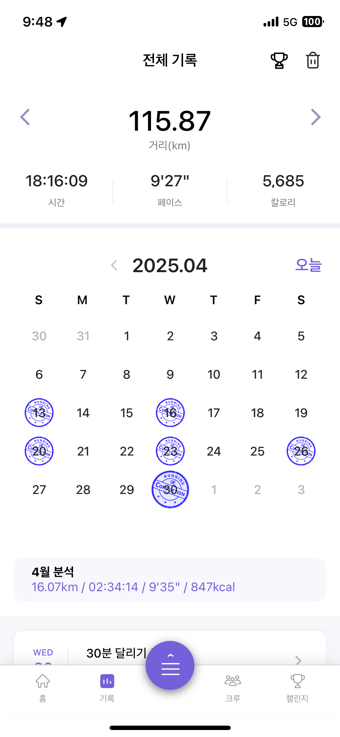 다음 날 큰 비가 예상되어서인지 대기에는 습기가 가득하다. 기온이 높았다면 불쾌지수가 폭발했겠지만 다행히 오늘은 4월의 마지막 날이라 매우 선선하다. 갑갑한 가슴을 부여잡고 런데이 어플을 켰다.