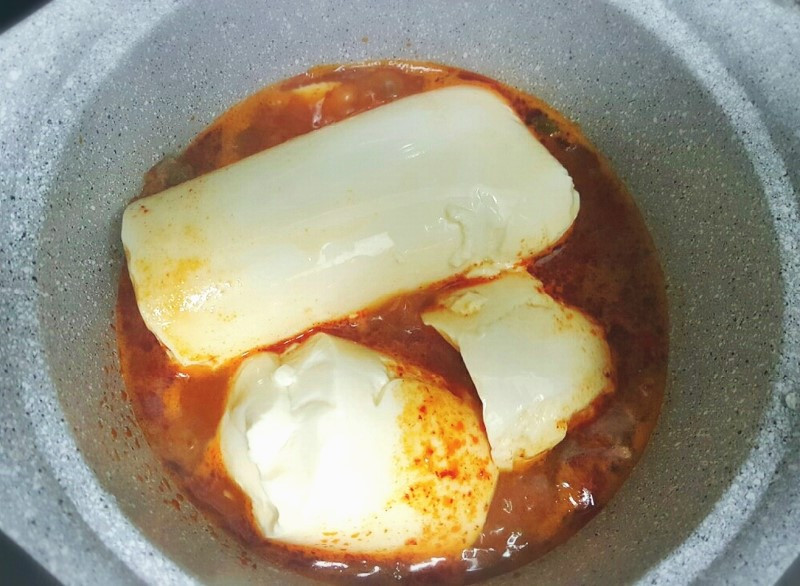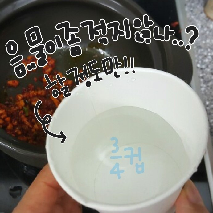 그 양념장에 물 4분의3컵을 넣고 끓이다가 순두부를 넣고