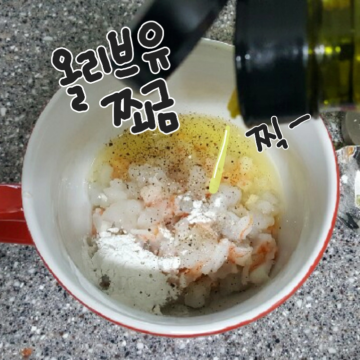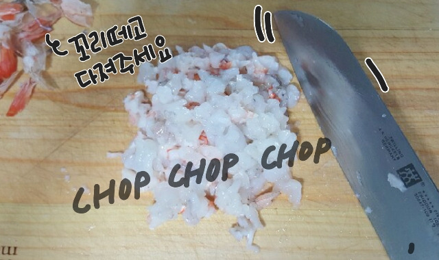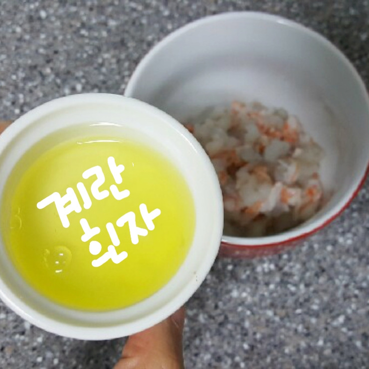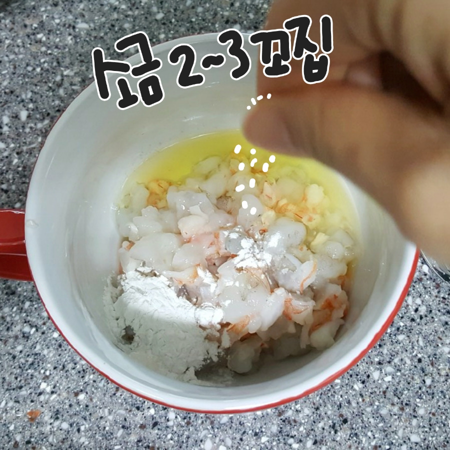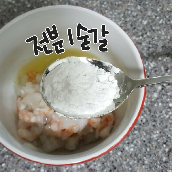 다진새우에 계란흰자 하나, 전분1큰술, 소금2~3꼬집, 올리브유 쬐금, 후추 조금 넣고 섞어주세요