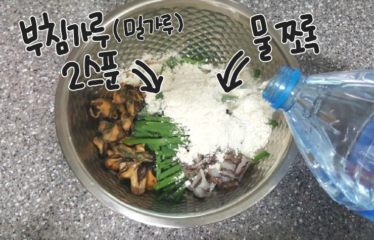 재료들을 한 데 넣고 부침가루 수북히 2스푼과