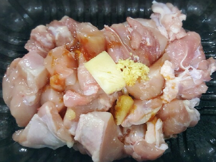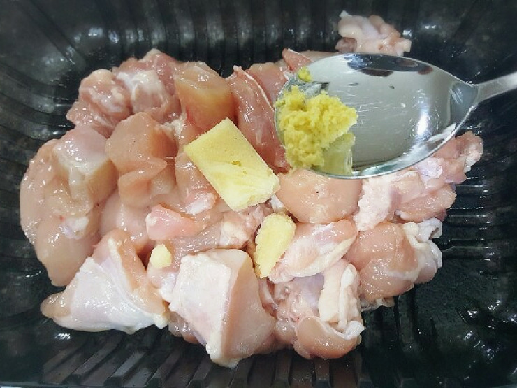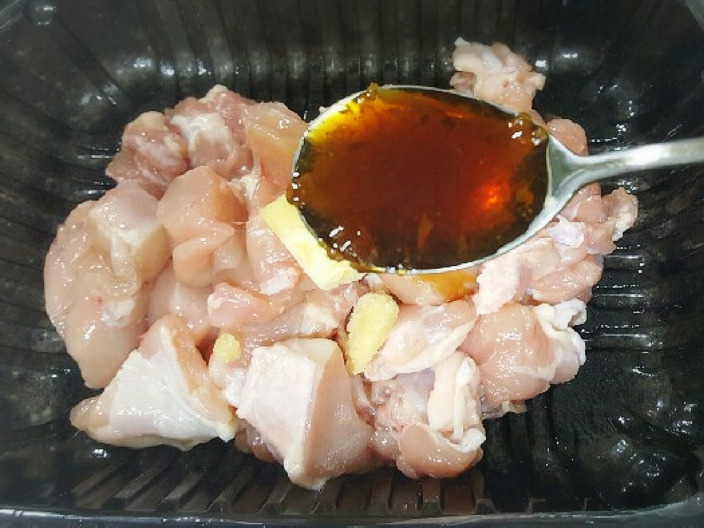 닭고기 재우기- 마늘0.5, 생강0.3, 간장1