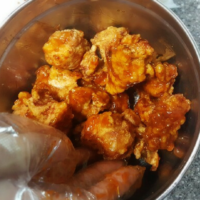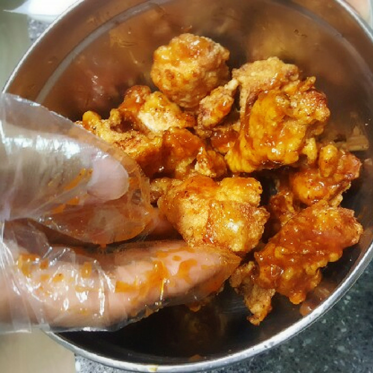 튀긴 닭 반을 넣고 양념을 버무립니다