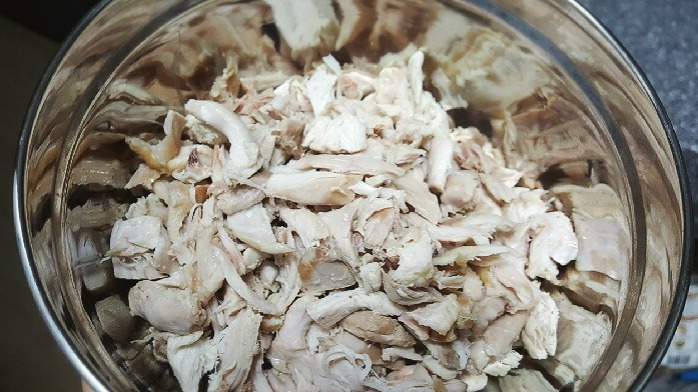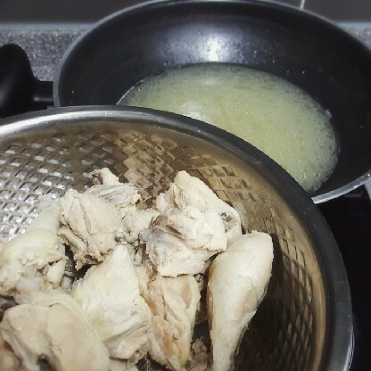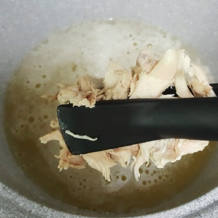 2. 국물만 거르고 닭고기 찢어두기