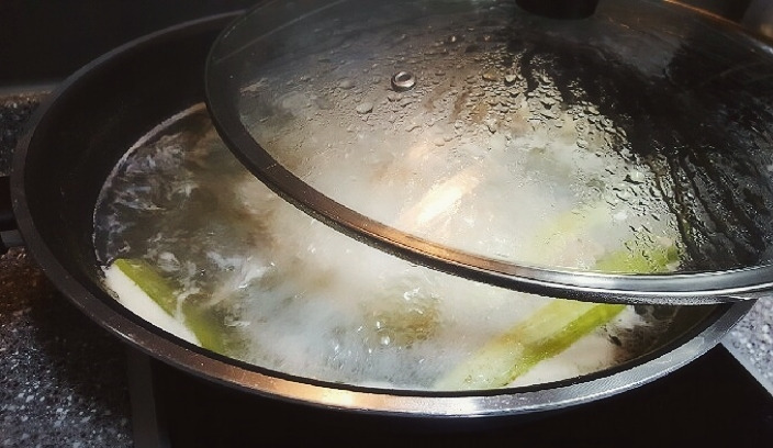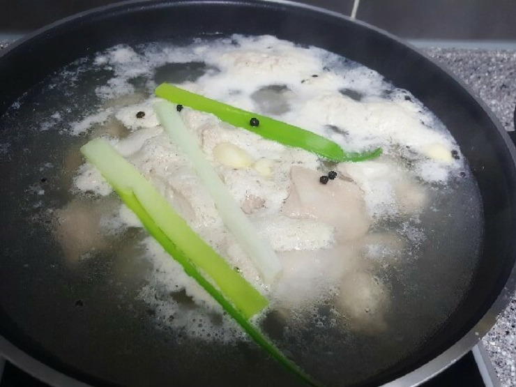 큰 냄비에 닭한마리, 대파1줄기, 마늘 서너알