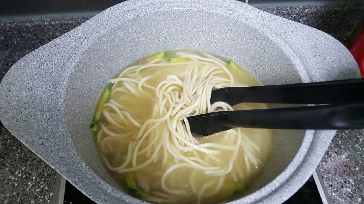 걸러낸 육수에 칼국수면, 호박, 닭고기 넣고 끓여내기