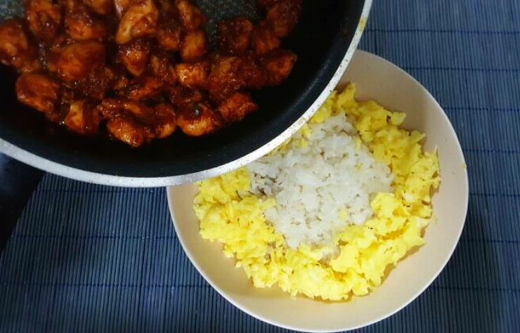 잘볶은 닭고기를 밥위에 소복히 얹어주세용!