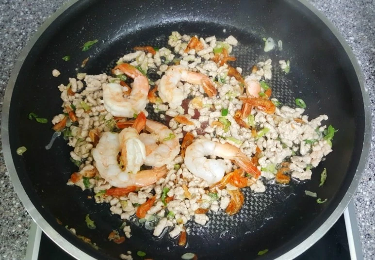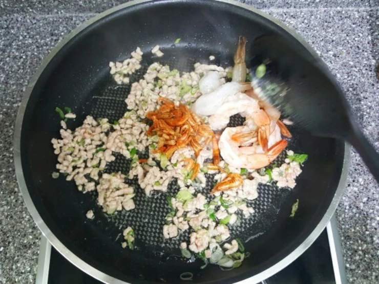 새우랑 건새우를 넣고 새우가 하얗게 익을때까지
