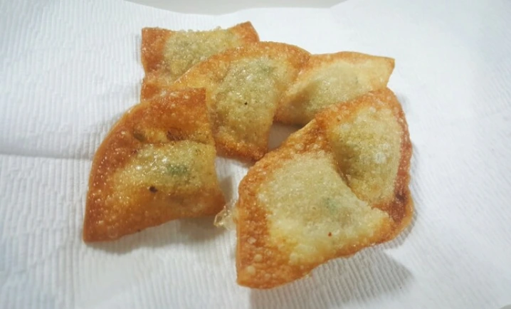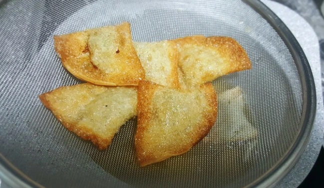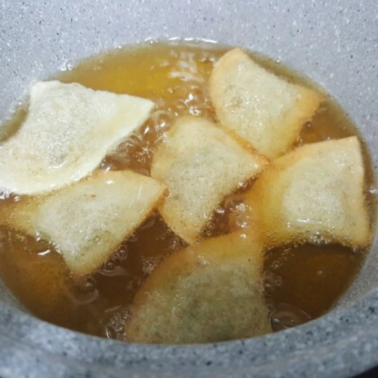 완탕 튀김. 예열한 기름에 노릇노릇 구워내기