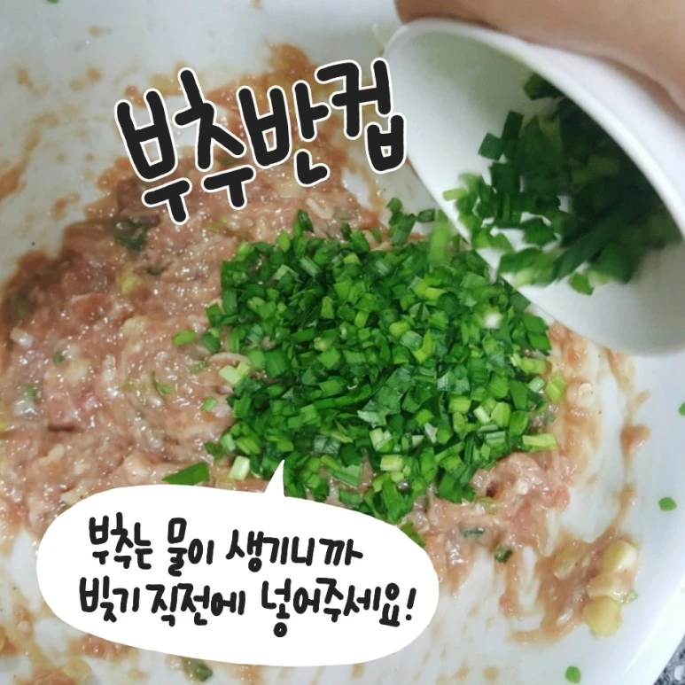 1-4) 마지막으로 부추 반컵을 넣고 한번 더 섞어주세요.