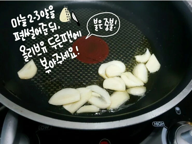올리브유를 두른 팬에 마늘 2,3알을 편썰어서 볶아주다가