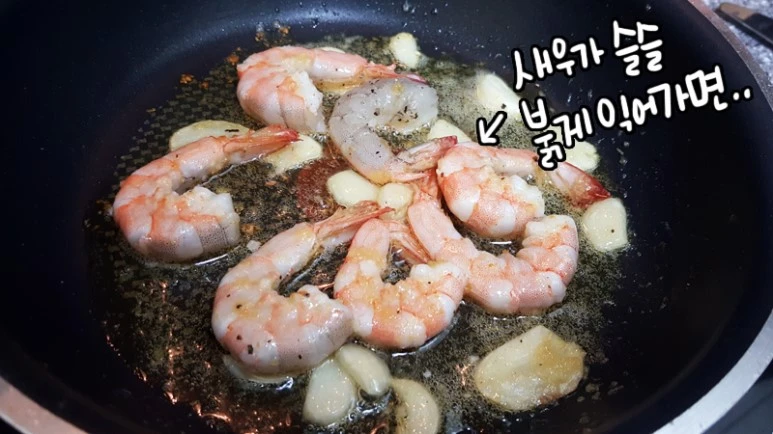 손질해놓은 or 해동해놓은 새우를 넣고!