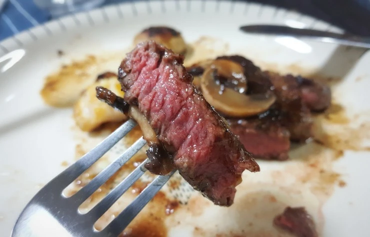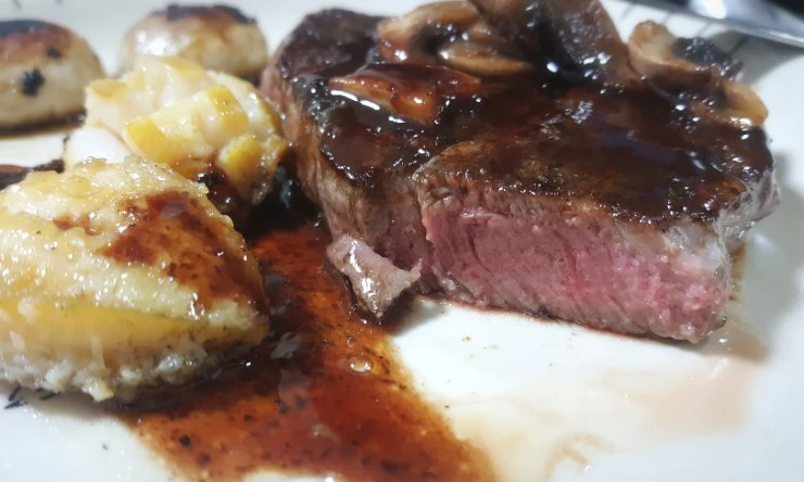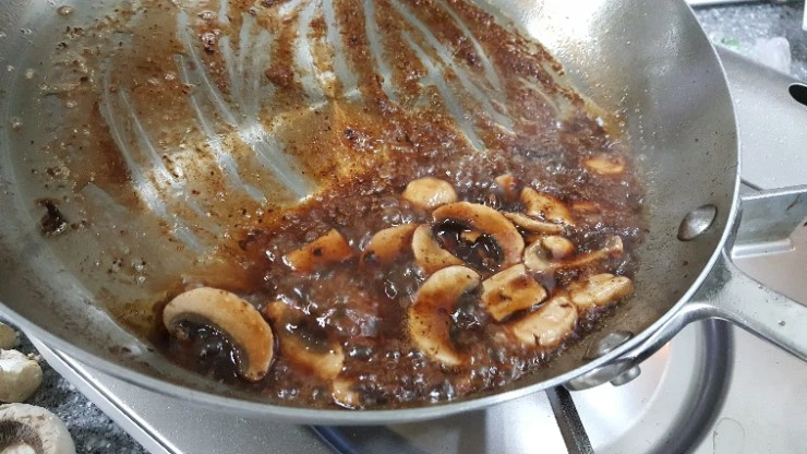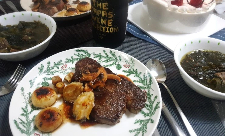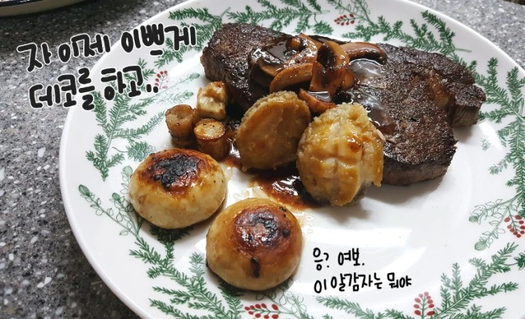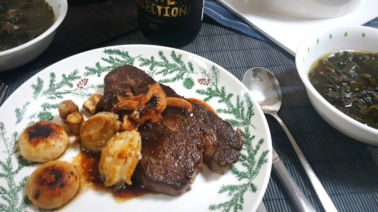 스테이크 소스: 레드와인, 시판 스테이크소스, 설탕조금, 양송이버섯