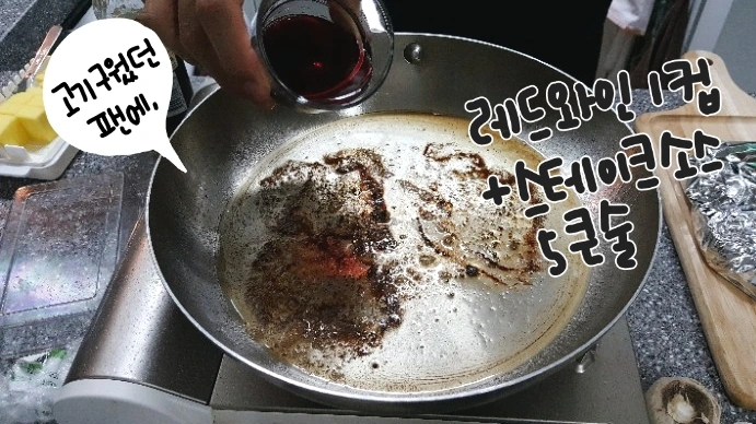 그 팬 위에 레드와인 1컵 + 스테이크소스 5큰술을 넣고 끓여주다가
