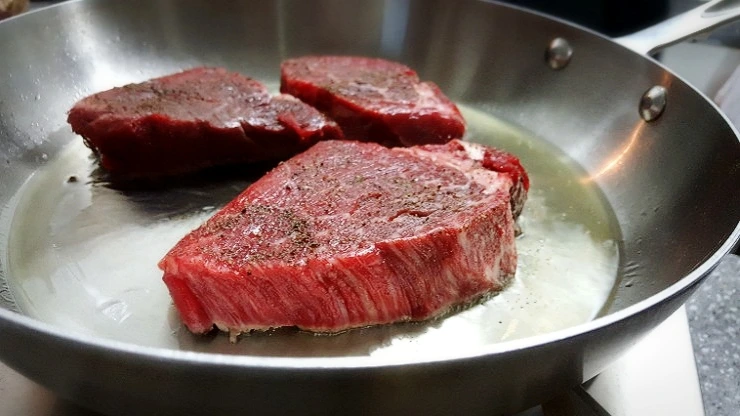 올리브유를 골고루 두른 팬에 고기를 얹고