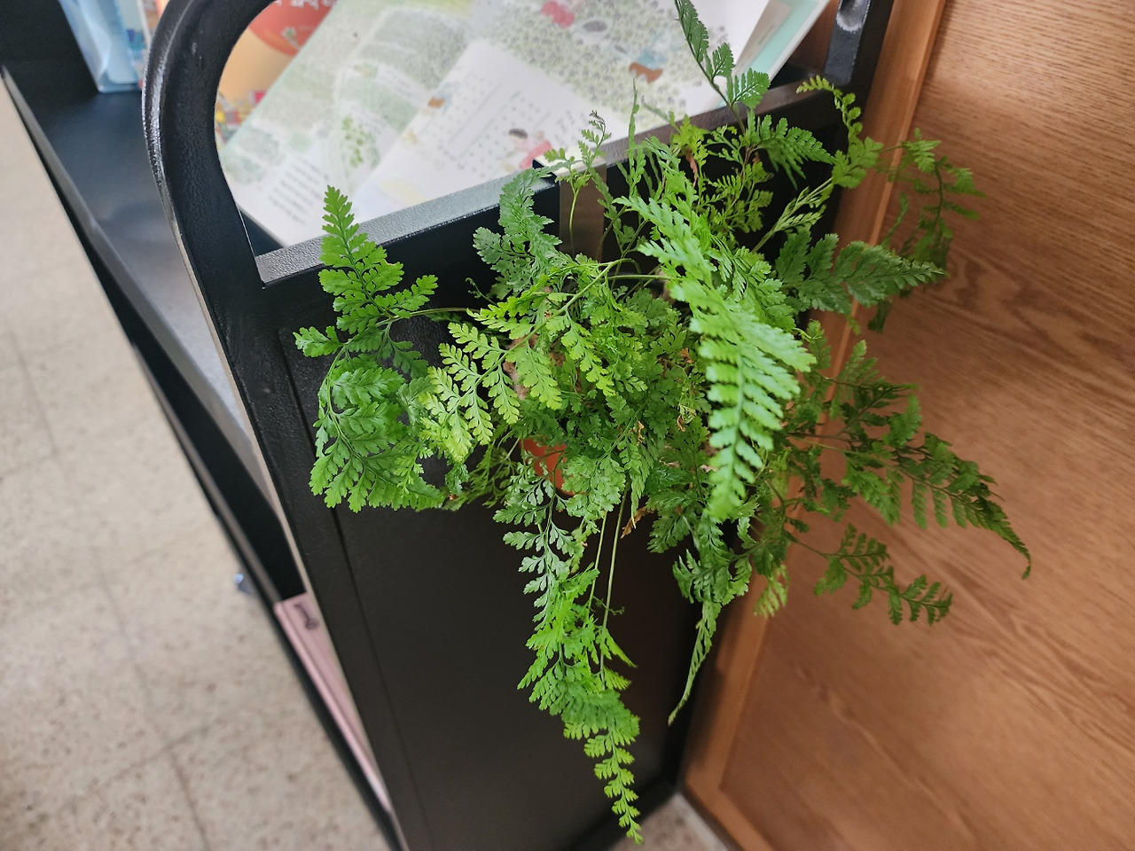 나는 그냥 그 문장 옆에 실제로 살아 있는 것이 보이면 좋겠다는 생각을 했고, 마침 우리 반에 있는 여러 화분 중에 하나가 놓이면 좋겠다는 생각도 그냥 했다. 그래서 우리 반 교실에 가서 내가 키우던 화분 하나와 그것을 걸 수 있는 고리를 함께 가지고 왔다. 준비한 화분은 내가 키우던 식물을 번식해서 새로 만든 화분이고, 걸 수 있는 고리는 다른 데 쓰고 남은 여분이었을 뿐이다.