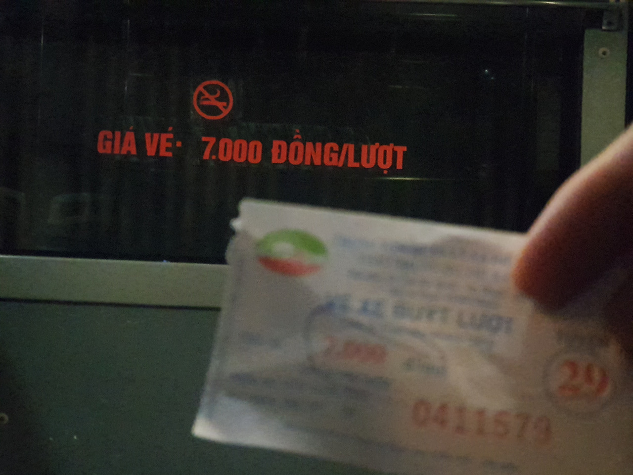 그런데 다행인것은 버스비가 싸다는 점이다. 창문에 적혀있는대로 7.000동(한화 약350원)에 불과하다. 베트남에서의 화폐 통용의 제일 작은단위는 1.000동, 2.000동, 5.000동이다. (500동을 본적은 있으나 통상적으로 사용되지 않는것 같다). 이러한 작은 액수의 지폐는 사실상 우리나라로 치면 50원,100원의 작은 액수이므로 베트남분들도 만일 거스름돈이 부족한 경우가 있다면 아예 받지 않는 경우도 있기때문에 찢어진 돈도 버스 요금으로 지불할 수도 있지 않을까라는 추론(?)을 할 수도 있게 하지만, 굳이 이를 확인해볼 필요는 없을듯하다.