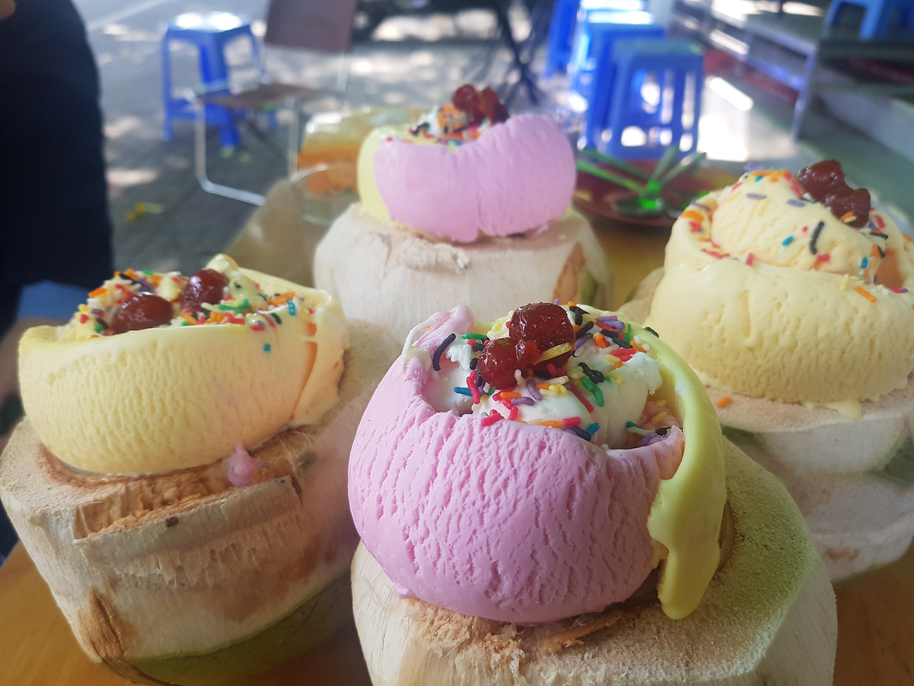 열대과일이 많은 관계로 코코넛에 아이스크림을 올려놓아 판매하기도 한다. 값은 4만VND(한화 약2천원)에서 5만VND(한화 약2천5백원) 정도 내외이다. 직원들과 함께 거리에 앉아 지나가는 오토바이를 보면서 먹었던 추억이 아직도 생생하다.