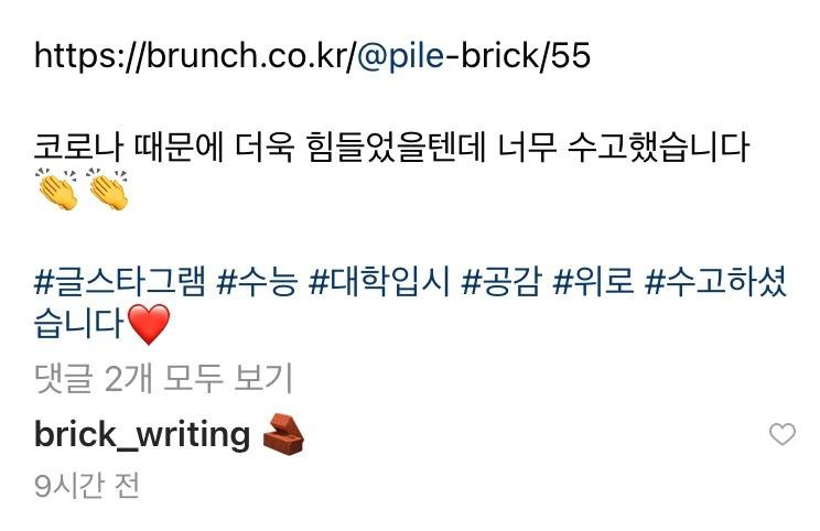 수능날 올렸던 게시글이다. 맨 위에 브런치 글 주소를 올려놨는데 '@pile'에만 링크가 걸려있다.