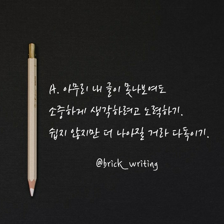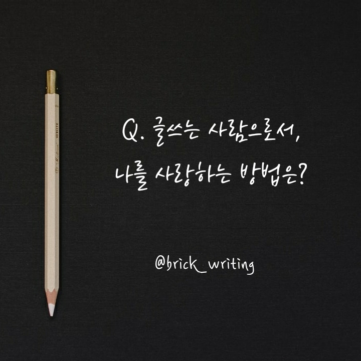 그리고 다음 날, 인스타그램에 나를 다독이는 글을 적었다. 글 쓰는 사람으로서 나를 사랑하는 방법을 스스로에게 물었다. 더 정확히 말하면 ‘내 글’을 사랑하는 것이지만, 내 글 또한 ‘나’이기에 포함해서 적었다. 그에 대한 답으로 '아무리 내 글이 못나보여도 소중하게 생각하려고 노력하기, 쉽지 않지만 더 나아질 거라 다독이기.'라고 나를 위로했다.