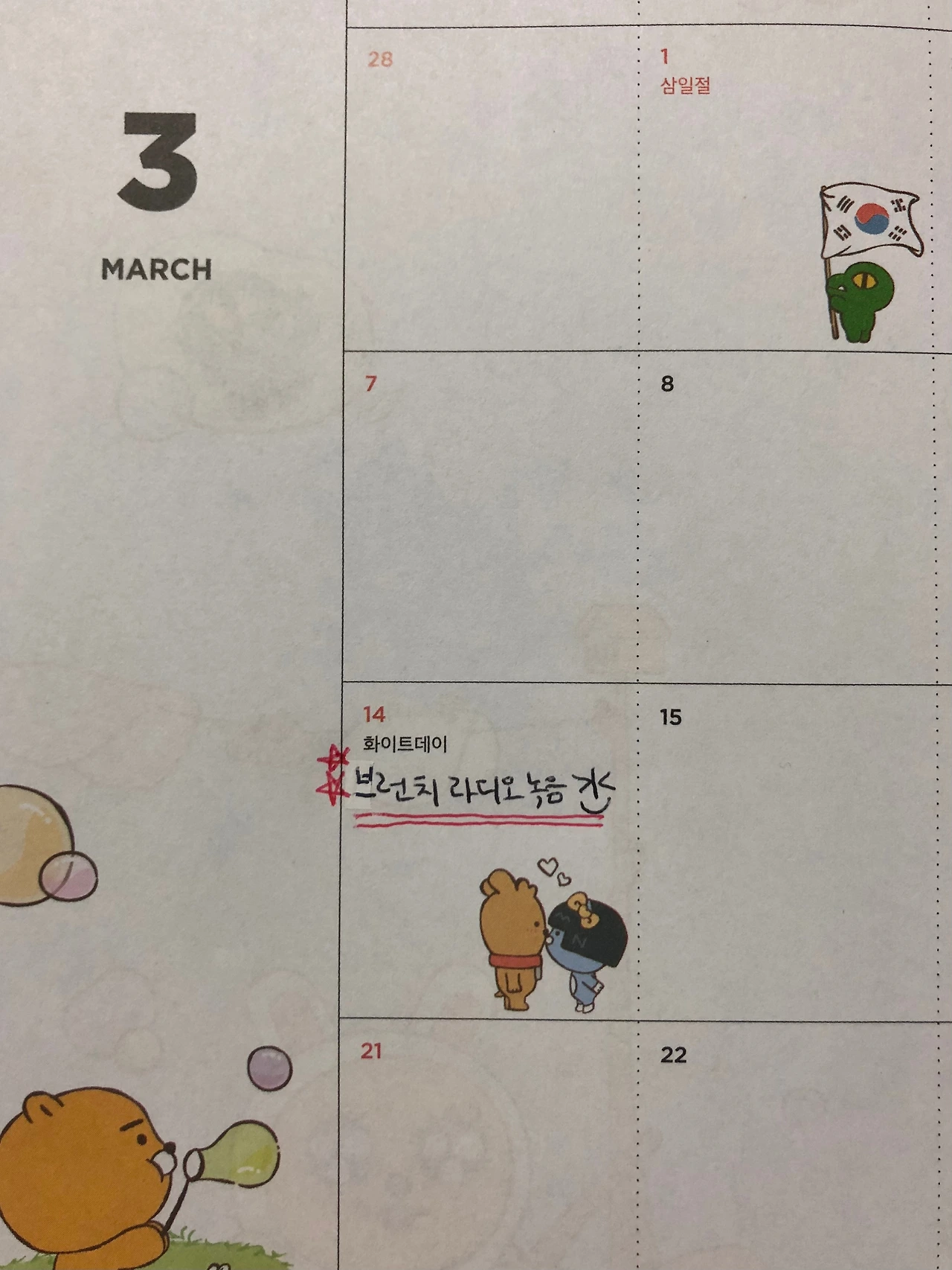 마지막에 녹음을 마치고 PD와 DJ를 맡으셨던 임희정 작가님과 얘기를 짧게 나누었고, 작가님과 감독님, 매니저님의 따뜻한 인사를 받으며 나왔다. 초대해주신 것도 감사한데 카카오 다이어리도 선물로 받았다. 올해 다이어리가 없었던지라, 더욱 기쁜 마음으로 감사하게 받았다. 다이어리를 펼치니 올해가 진짜 시작됐다는 기분도 들었다. 소중한 경험을 선물로 주신 브런치팀께 감사드린다. 아, <브런치 라디오> 시즌2는 멜론에서 4월 초에 공개된다고 하니 모두 기대해주셨으면 좋겠다.