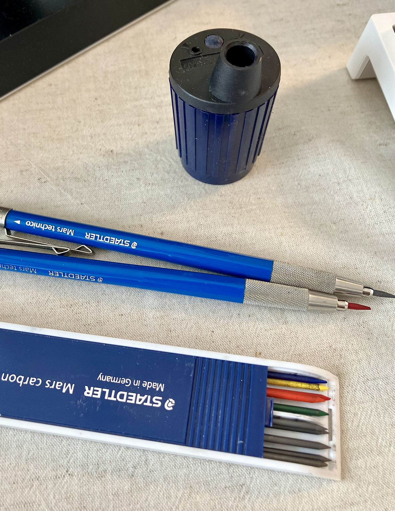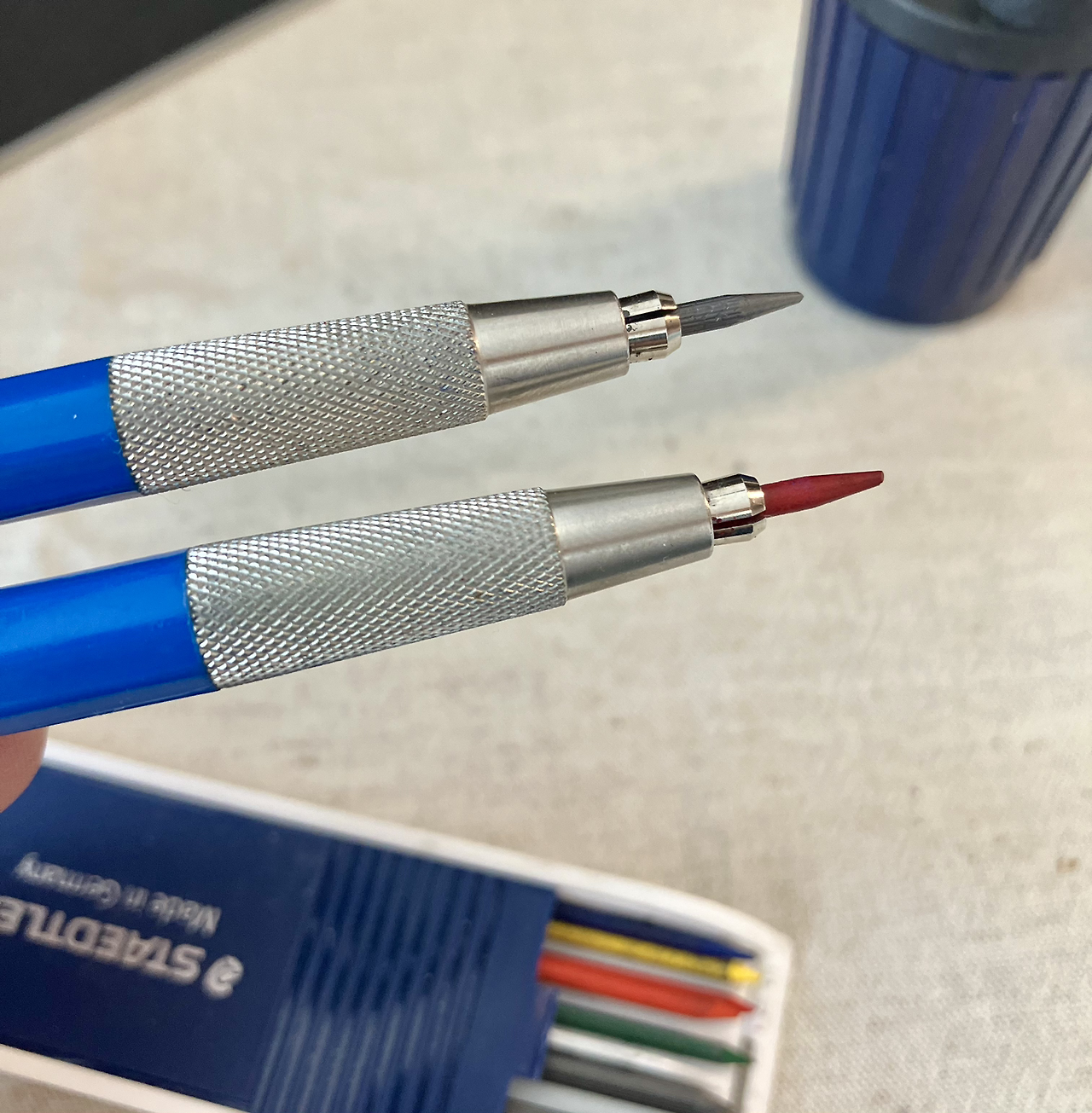 그래서 선택한 제품이 바로 Staedtler의 홀더 펜슬입니다. 원래 용도는 목공이나 제도를 하는 분들이 사용하는 펜이지만, 저는 연필과 같은 용도로 사용하곤 합니다. 홀더 샤프너와 함께 들고 다니면 평상시에도 연필을 깎는 느낌으로 사용을 합니다.