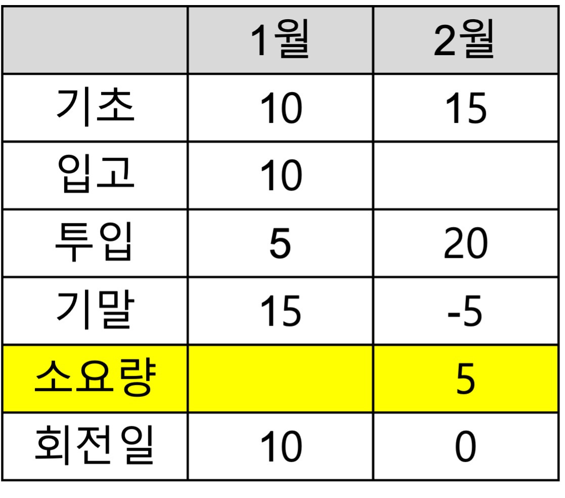 (회전일 공식은 별도 설명하겠지만, "투입물량 / 기말재고 X 해당 월 일수"로 계산을 하시면 됩니다.)