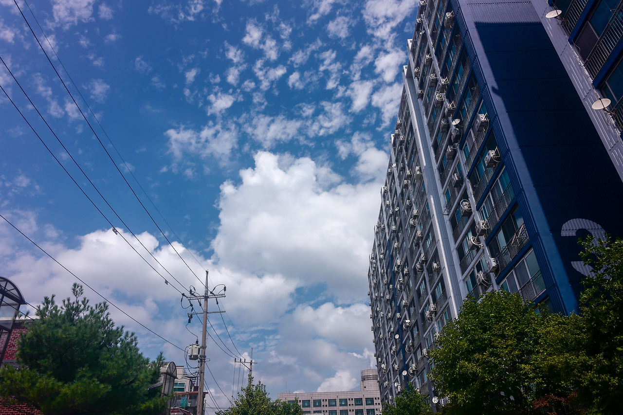 비가 막 온 직후라 그런지 하늘은 그 어느 때보다 푸르렀다. 사실 서울의 하늘에서 푸르름을 기대하는 것은 큰 사치다. 분명 서울 하늘은 매연과 먼지로 가득 차 있었고 늘 뿌연 하늘만 펼쳐질 뿐이다. 하지만, 비가 막 온 직후의 하늘은 그 어느 때보다 푸른 하늘을 보여준다. 우리가 정말 놀랄 만큼, 마치 여행지에 왔던 것처럼 정말 멋진 하늘을 만들어준다. 이날도 카메라를 들고 집 밖으로 나갔을 때 보았던 푸른 하늘에 넋을 잃고 찍었던 사진이다. 별도 보정을 하지 않고 찍었지만, 단지 부족한 건 사진을 찍는 사람의 기술과 구도일 뿐이었다. 그만큼 하늘은 완벽했다.
