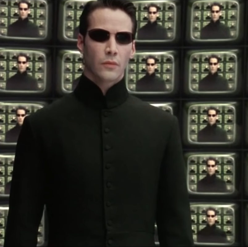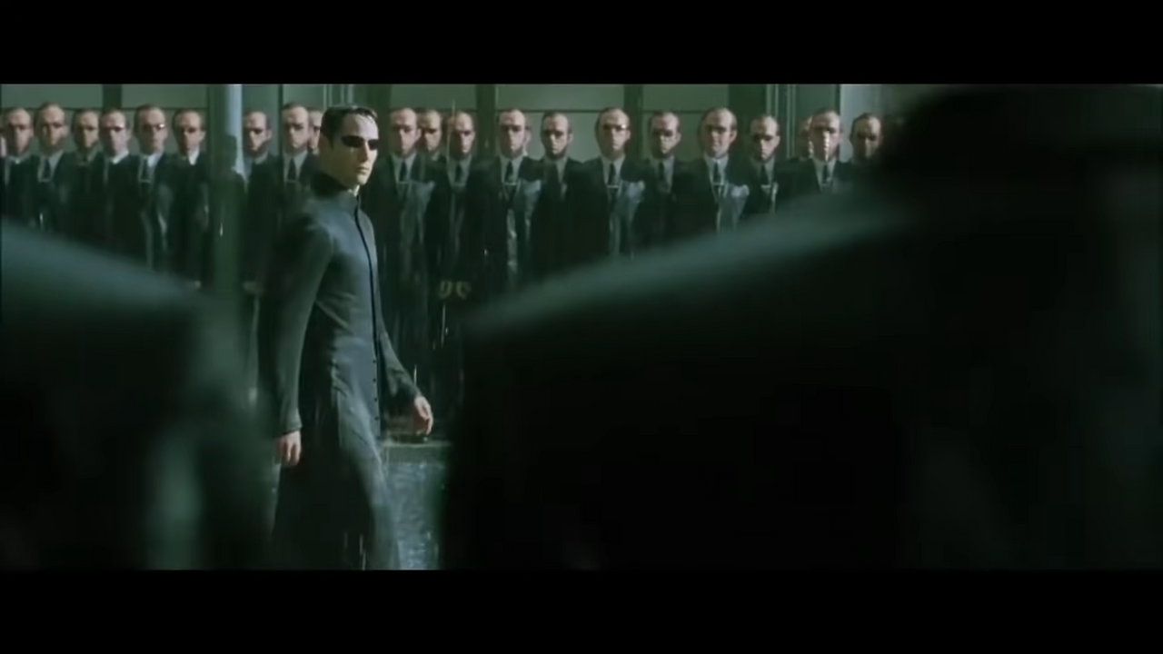 영화 '매트릭스'에서 인간을 감시하는 요원들은 양복을 갖춰입고 있다. 반면 요원과 요원들의 모체인 기계들에 저항하는 인간 저항군은 가죽자켓이나 코트를 입는다. 얼핏 생각하기엔 그저 멋있어서 택한 코디네이션 같지만 곰곰히 비교해보면 기성세대와 록큰롤 세대를 레퍼런스한 듯한 패션을 통해 두 진영의 대립을 표현한 것이라고 볼 수도 있다. 그런 의미에서 검은 양복 차림의 백인 중년 스미스가 차렷자세로 열을 지어있는 최종장 속 장면은 전체주의를 은유하는 것 같기도 하다. 그러나 이 장면에서 스미스는 만물이 무가치하다고 믿는 '허무주의'를 상징한다고 한다. 하지만 사복차림의 네오가 홀로 그 무리를 뚫고 걸어나가는 장면은 '저항' 혹은 '구세주'라는 테마를 표현하기에 훌륭한 미장센이었음에 의심의 여지가 없다.