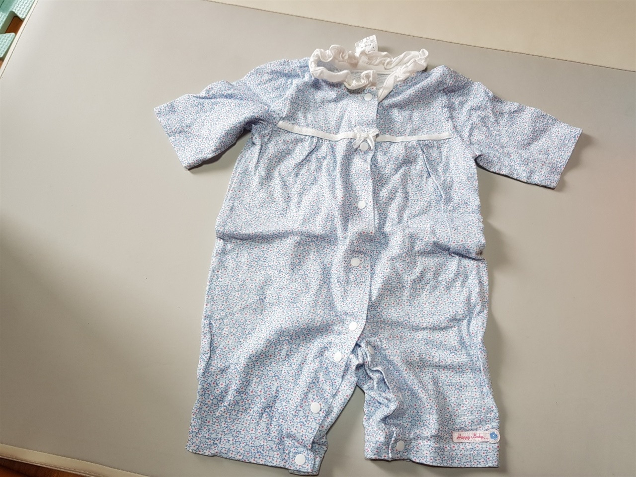 아기가 입었던 외출복이다. 아기에게 이 옷을 입히고 산책을 나갔다. 유모차에 아기를 태워서 나갔는데, 아기 엄마가 여름이라 아기가 더워하지는 않는지 표정을 살피고 필자가 운전을 도맡았다.