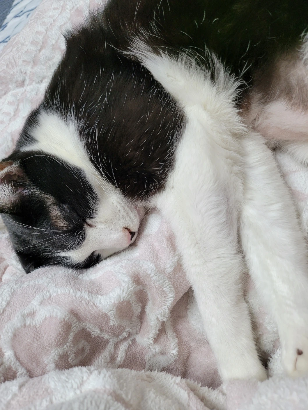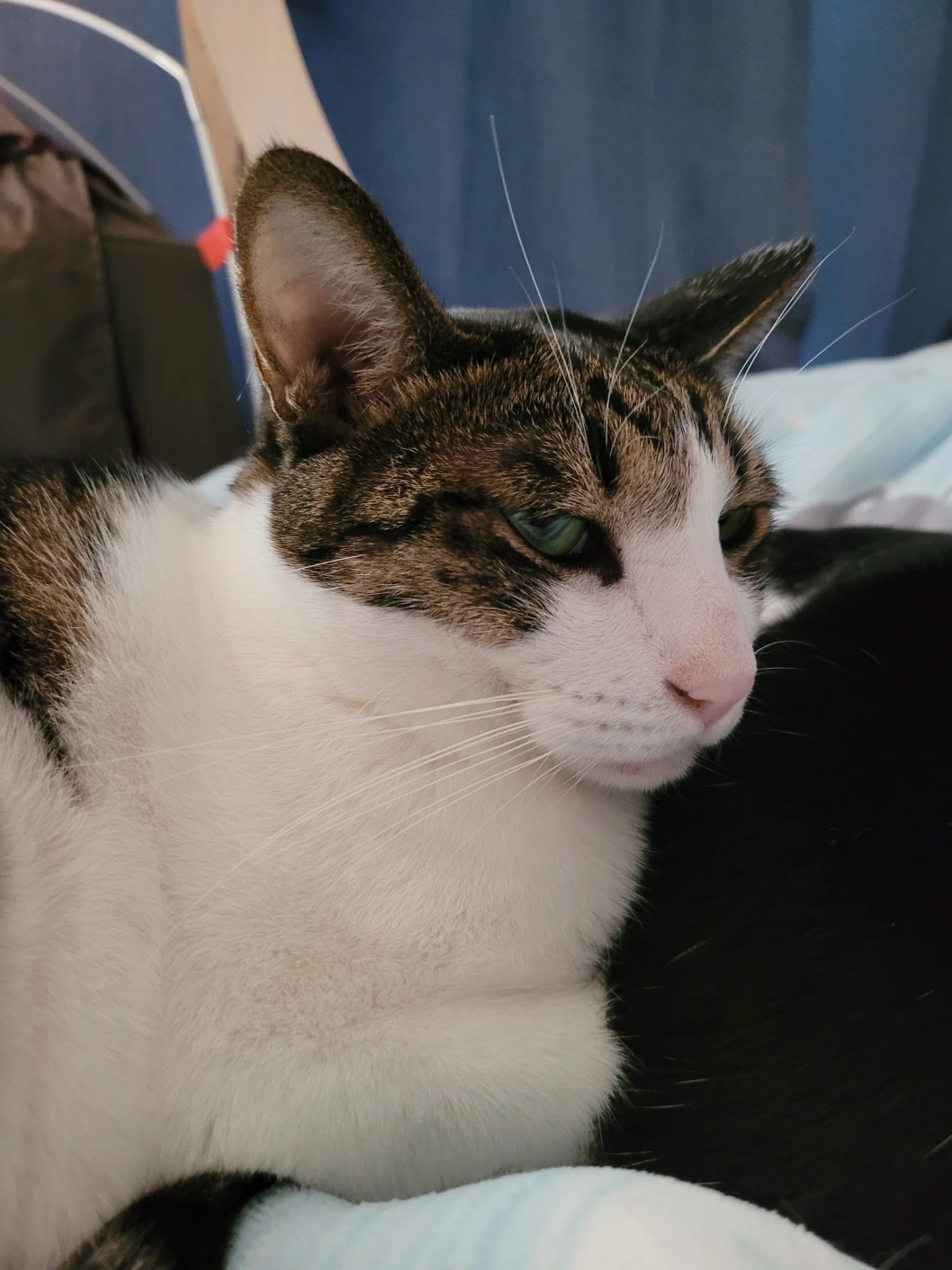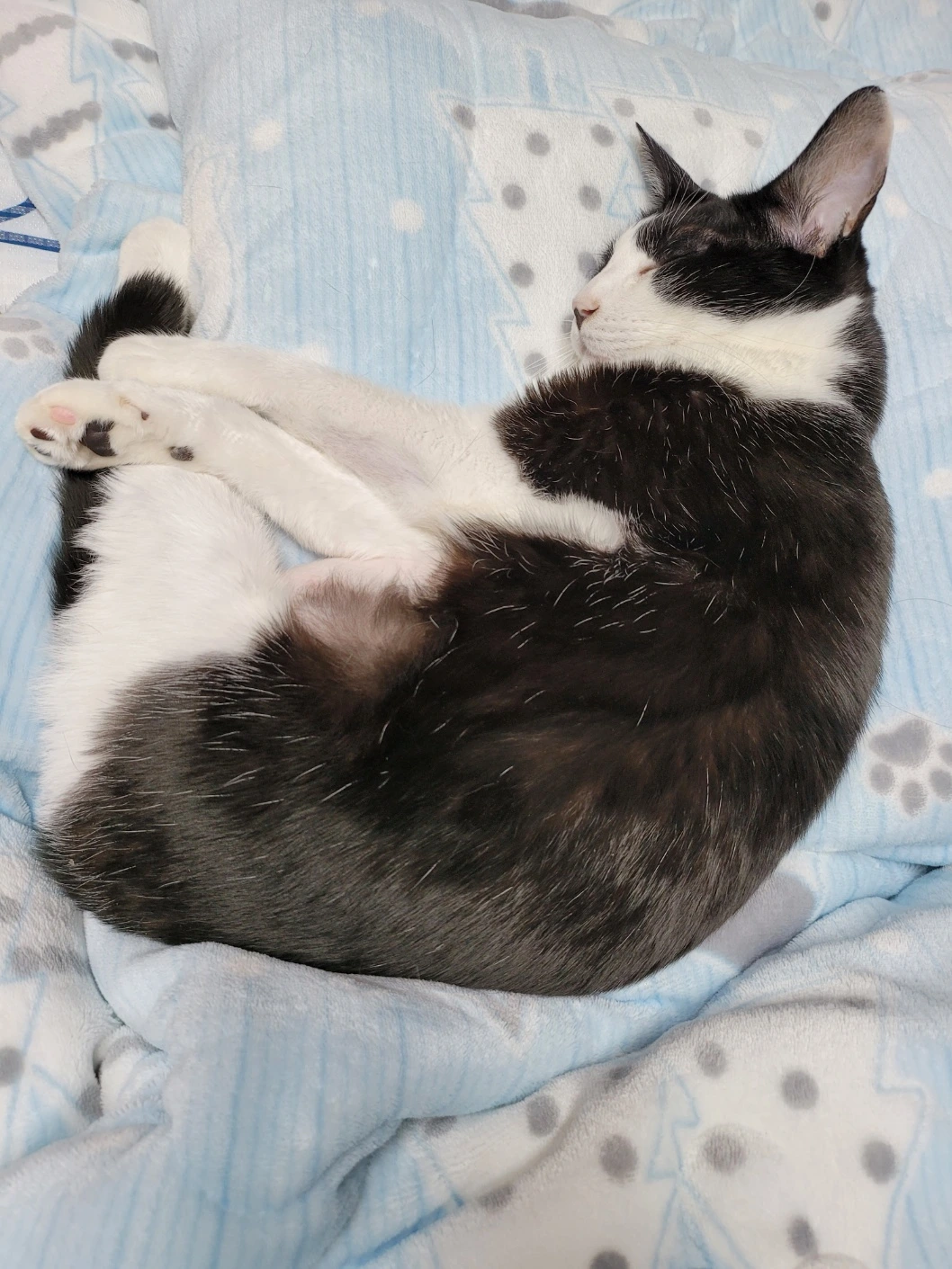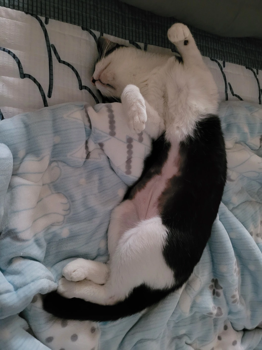파란 이불 위 사진처럼 이사 후 스트레스 때문에 그루밍 중독이었다. 병원에서 상담해 봤는데, 스테로이드 약물을 써야 한대서 보류했다. 지금은 새로운 겨울털로 자라고 있어서 다행이다.
