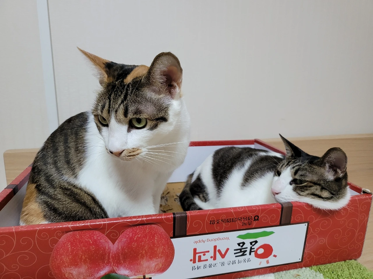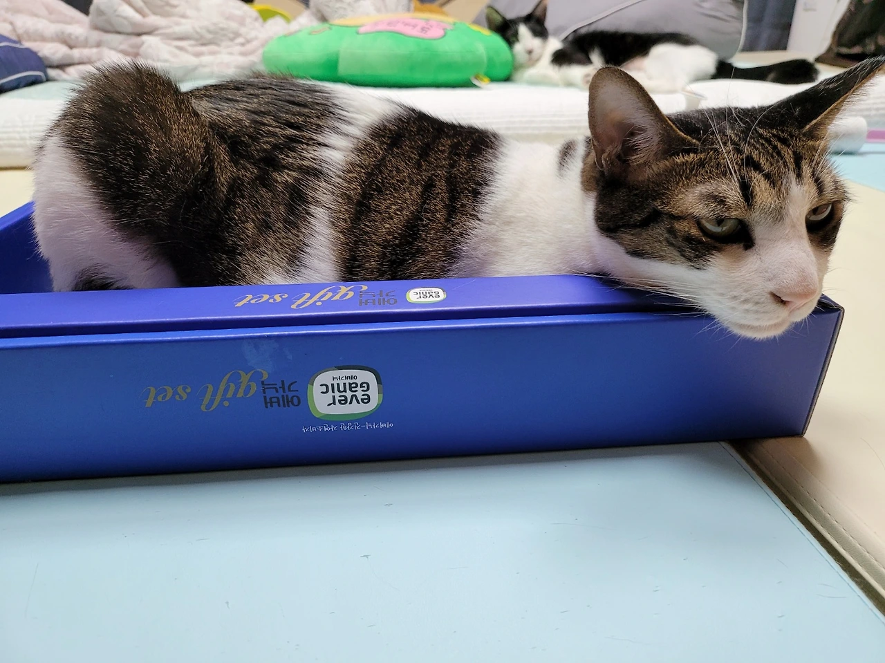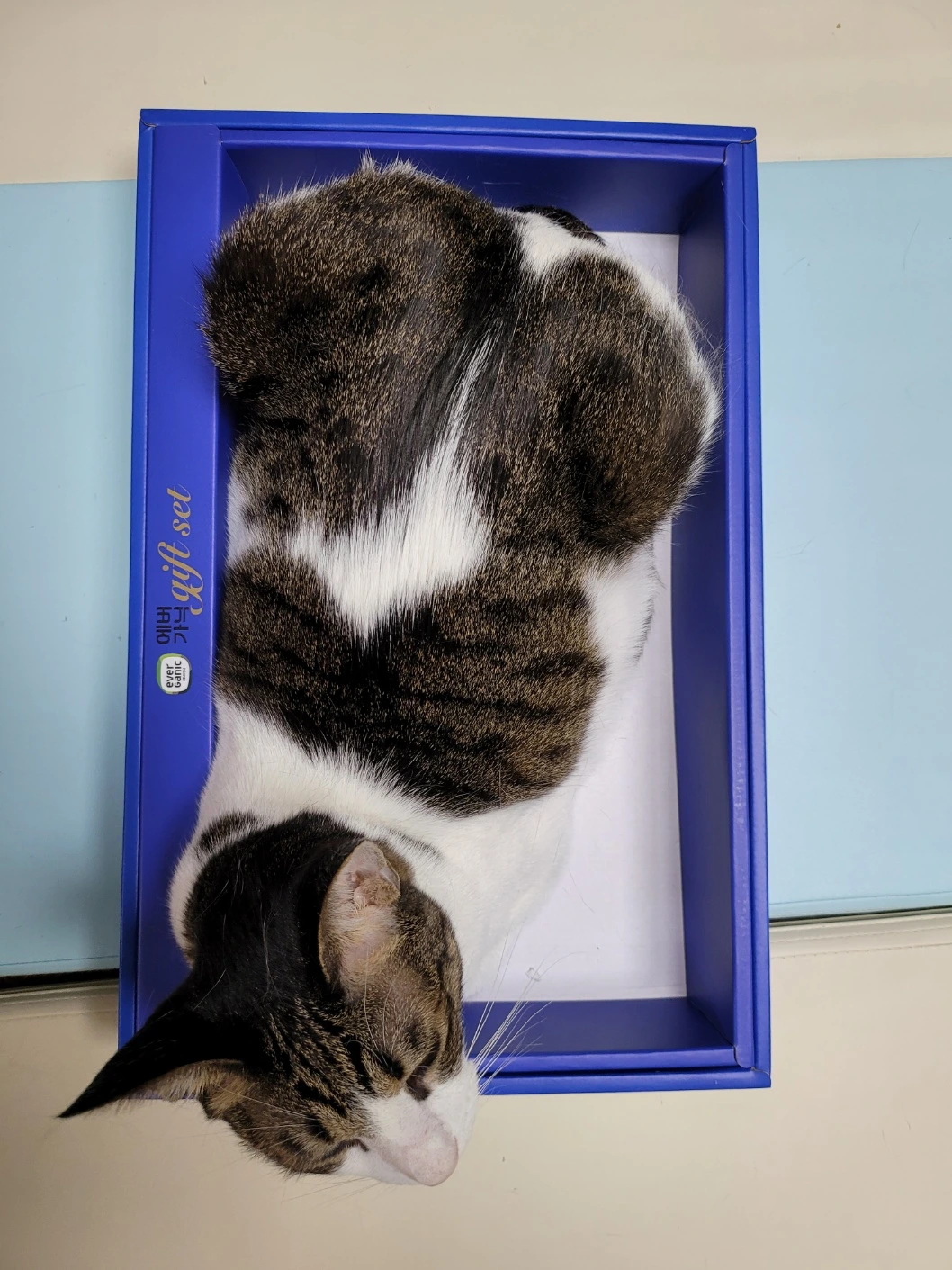 우리 부모님은 자영업자라서 명절마다 선물세트를 맞추고, 많은 거래처분들과 교환한다. 퇴근길에 하나씩 집으로 가져오면 엄마는 내용물을 정리하고, 박스는 항상 고양이들이 갖고 놀도록 놔둔다. 엄마도 말만 고양이들 귀찮다고 할 뿐이지, 가만히 지켜보면 고양이들한테 애정이 많다.