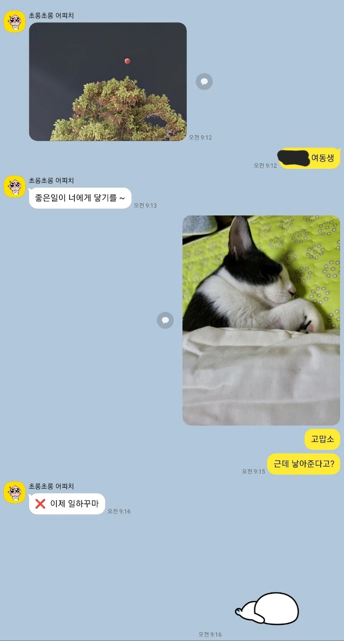 “하하, 그러면 나 ㅇㅇ(첫째)이 부산에서 좀 키우고 와도 돼? ㅇㅇ이, 누나랑 기차 타고 부산에서 살래? 저번에 영상통화로 누나 집에 고양이들 있는 거 봤지? 같이 가자.”