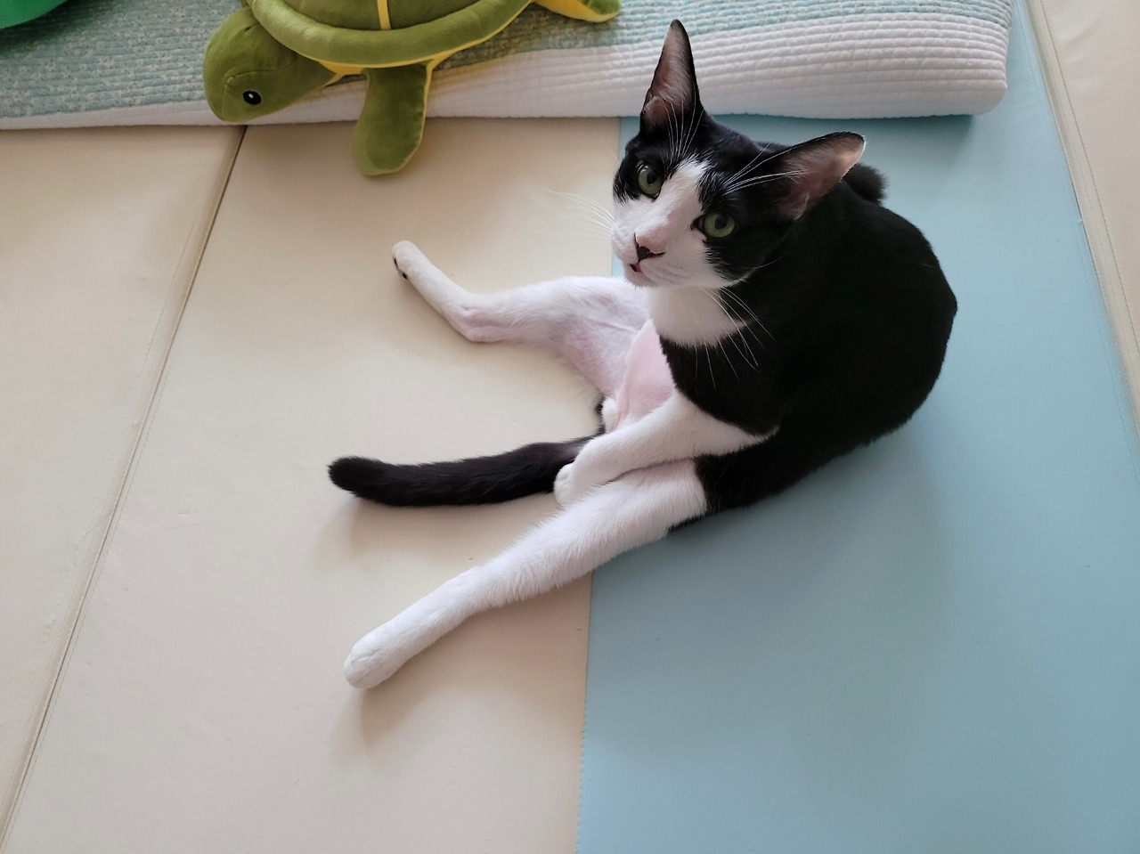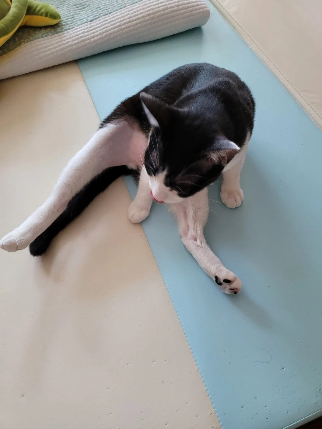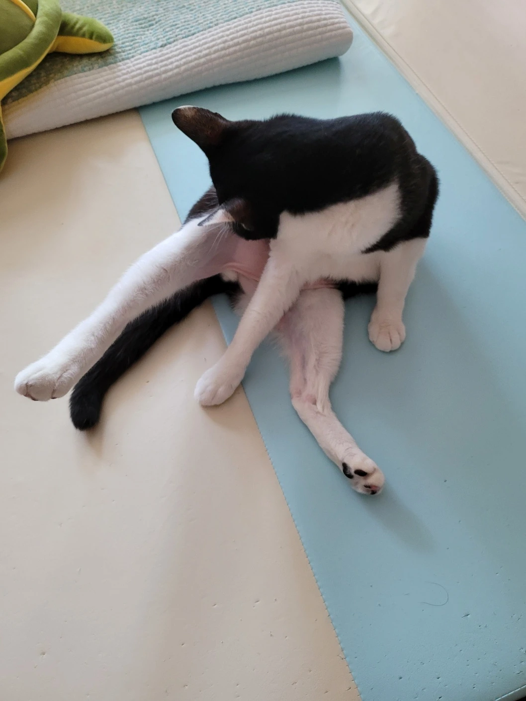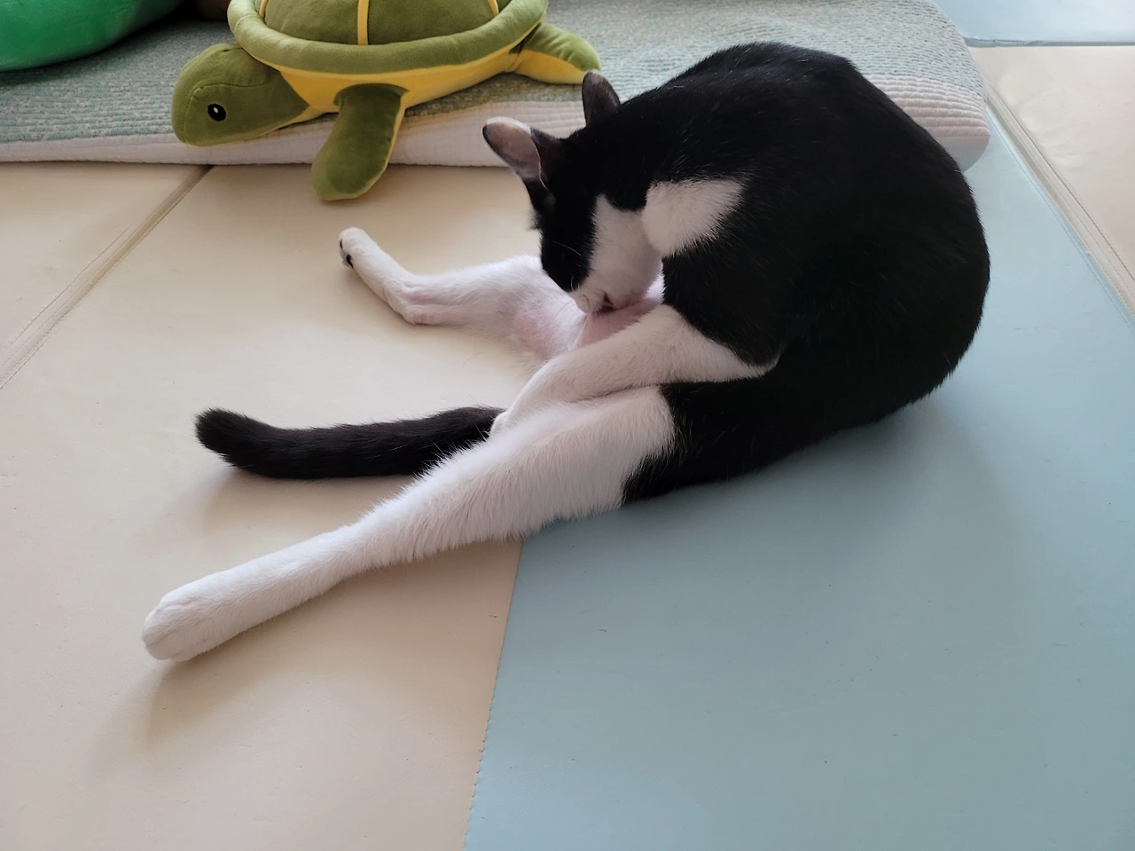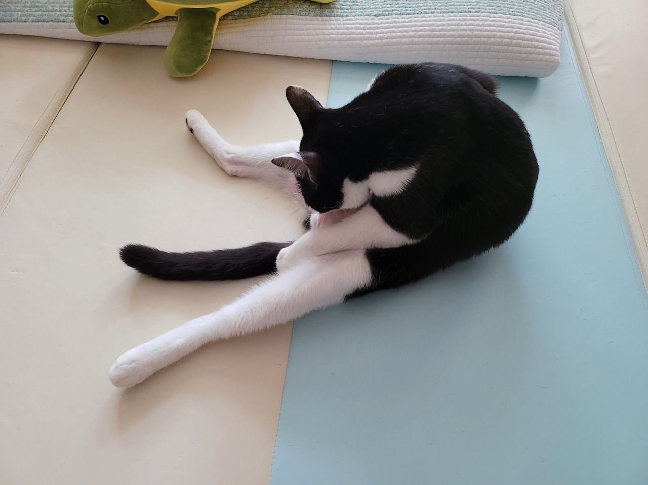 막내가 창문밖을 한참 구경하더니, 벚꽃놀이 가려고 열심히 목욕하고 있다. 신사답게 턱시도를 항상 깨끗하게 유지해야 한다. 슥-슥-
