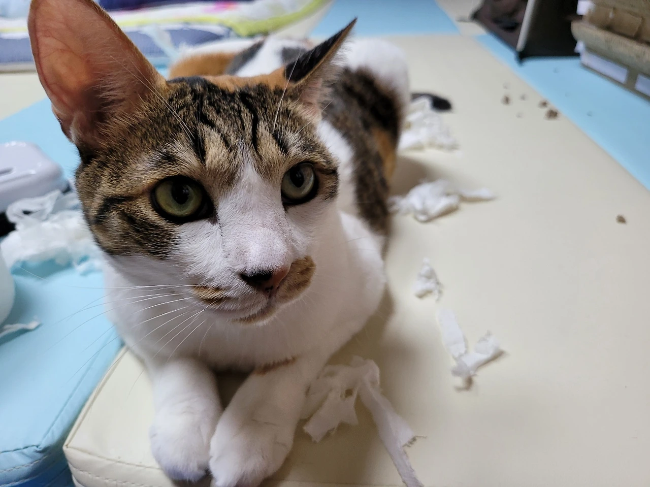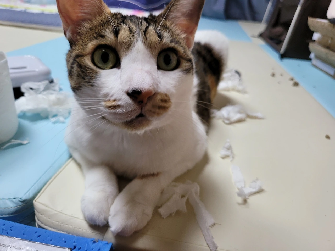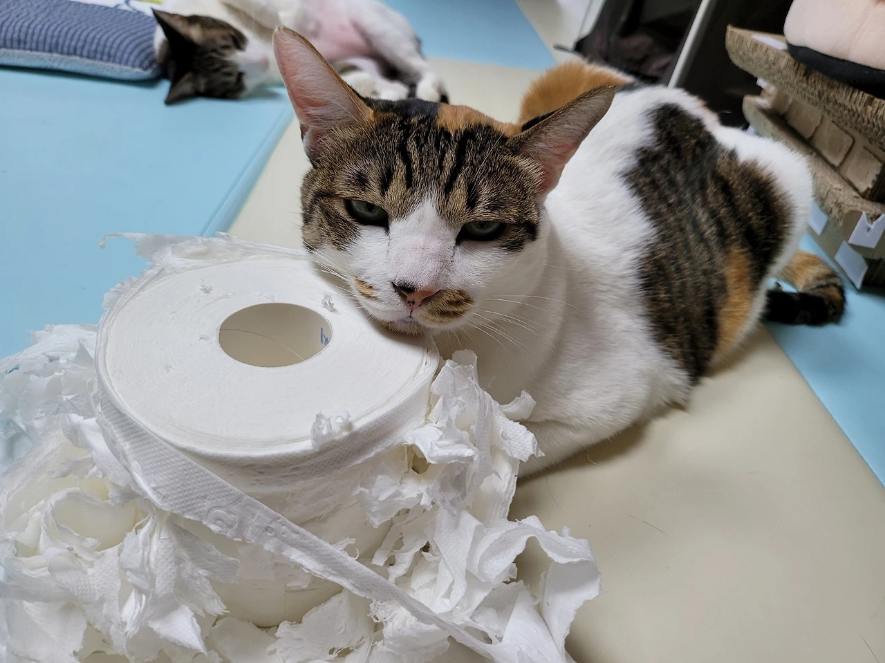 정말 뭘 잘못했는지 모르는 표정이다. 신입이는 나에 대한 애착이 너무 강해서, 항상 내가 씻을 때 거실이나 내 컴퓨터방에 있는 휴지를 화장실 문 앞으로 물어 온다. 그리고 패드에 게으른 집사를 위한 일거리를 만들어 놓는다. ‘집사가 화장실을 들어가면, 나도 화장실을 가겠다.’라는 뜻일까? 씻고 나와서 신입이의 사건 현장을 발견한 집사… 젖은 머리를 말릴 새도 없이 찝찝하게 옷을 입고 뒷정리를 한다.