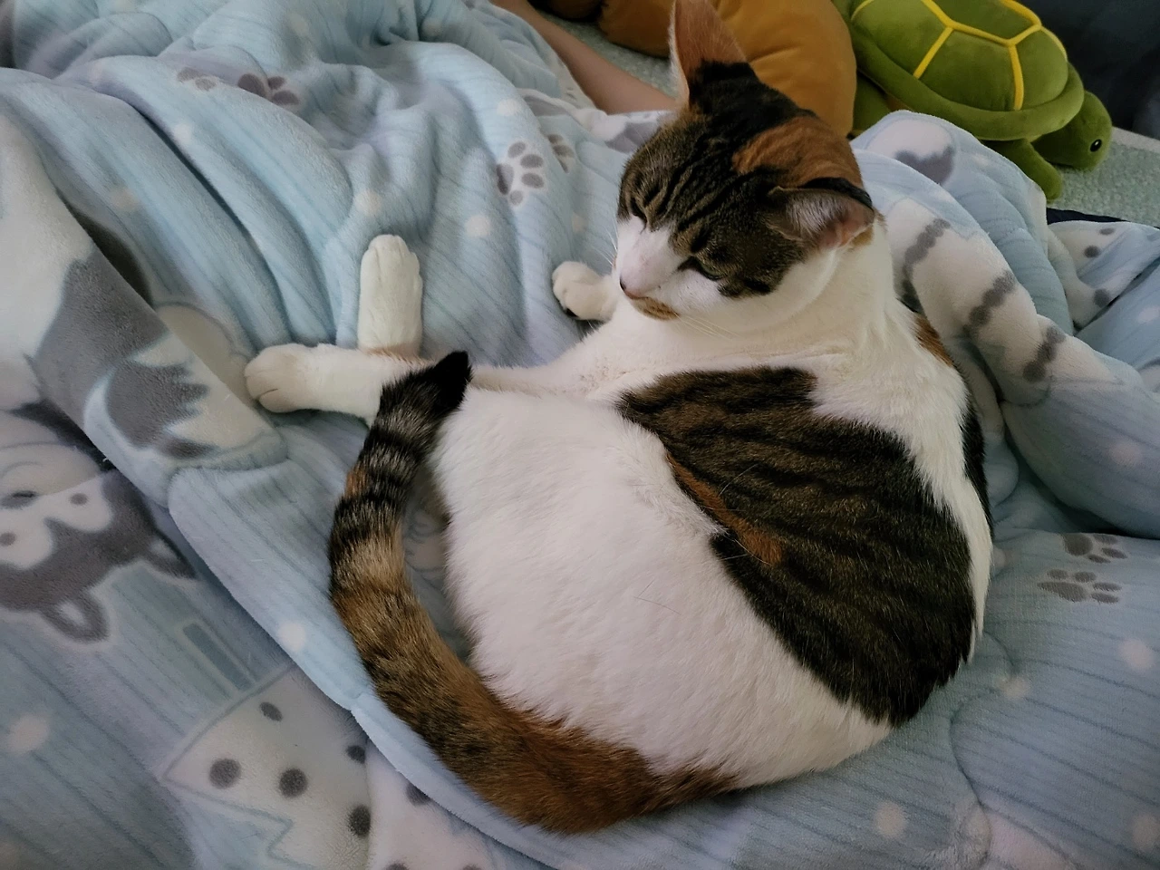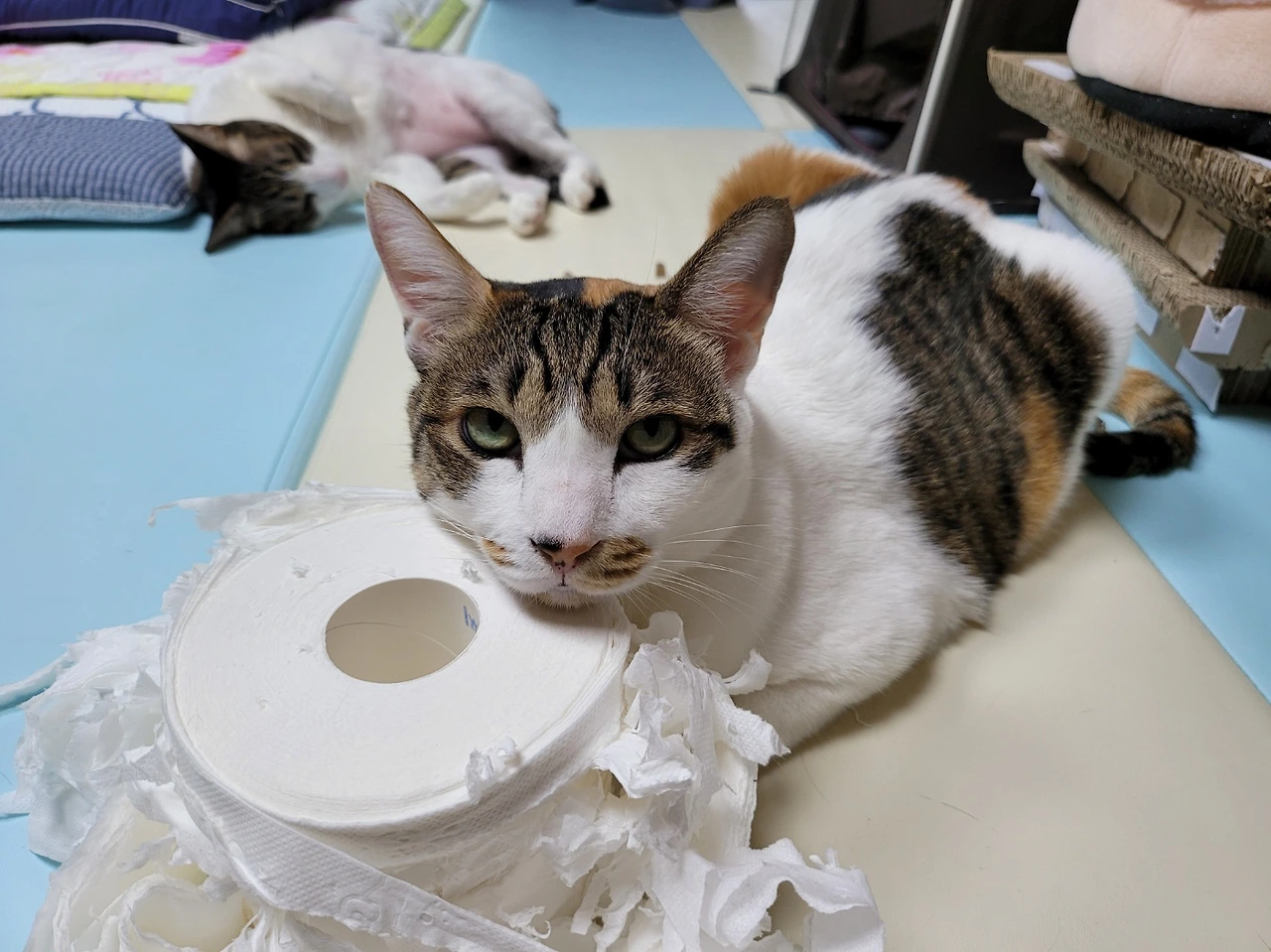 신입이가 패드에 오줌을 싸면 엉덩이를 닦아주려 꺼내 놓았던 휴지를 다 물어뜯었다. 그러거나 말거나 초바는 뒤에서 뱃살을 드러내고 꿈나라에 갔다.