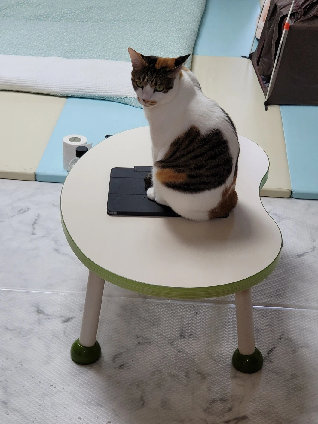 게다가 요즘은 아이패드 위에 자꾸 올라가서 문제다. 자세히 보면 아이패드 케이스, 사고뭉치 고양이들의 관절을 위해 새로 산 매트 위에도 스크래치 흔적이 있다.