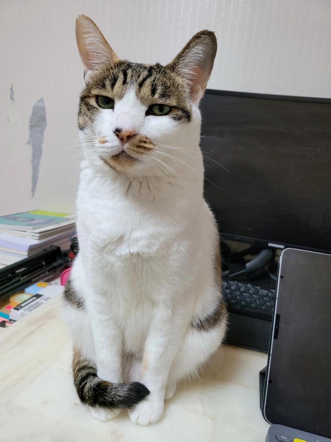 근엄하게 앉아 공부하는 집사를 지키고 있는 신입이 왼쪽에 뭔가 보인다면, 그것 역시 신입이의 작품이다. 벽지 구멍이 점점 넓어지고 있다. 아무리 좋은 스크래처도 집사들의 살림살이를 이길 수는 없는 법. 이제는 막내 요뜨까지 엄마냥 신입이를 따라 벽지를 긁고 있다. ‘고양이 싫어’ 염불을 외는 엄마 집사의 마지막 믿음이었던 요뜨도 결국 고양이었으니…