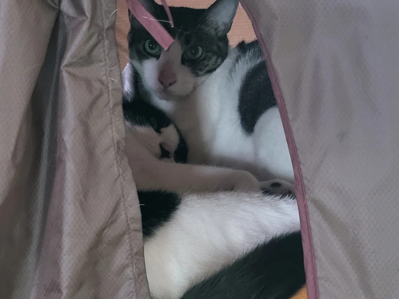 (에어컨을 피해 텐트 안에서 사이좋게 붙어 자는 형제 ‘초바’와 ‘요뜨’)