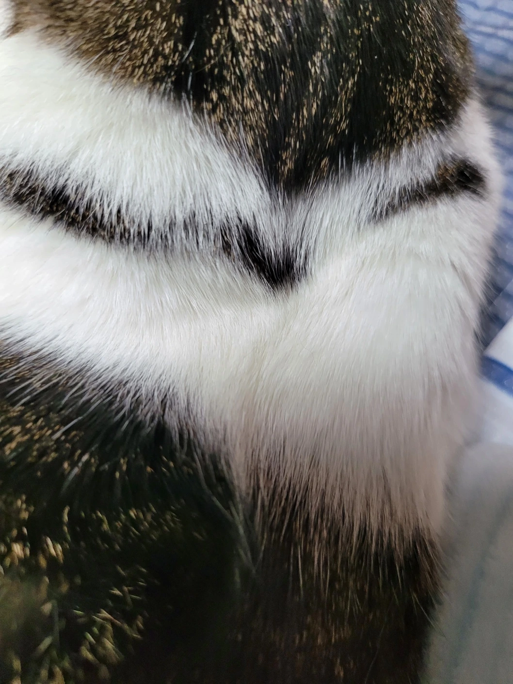 초바의 목덜미에는 점 세 개가 있다. 그래서 이름 후보 중에 별자리 이름도 있었다. 근데 이제 살쪄서 식빵 굽는 자세를 하고 있으면, 하핫… 크흠, 목에 튜브가 생기는 바람에 목덜미 점들이 꾸깃꾸깃 축소된다. 뒤통수부터 꼬리까지 쭉- 빗질을 해주면 목덜미에 방지턱 때문에 꾸울-렁하고 넘어간다.