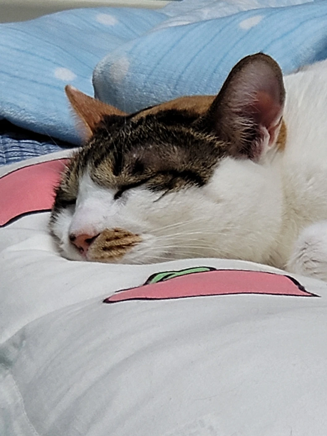 신입이가 정착하고 여러 집사들이 살펴봤는데, ‘야아아아아옹~ 야야야옹’하는 발정기 울음소리를 계속 냈었다. 아마 발정기가 와서 가정집에서 울음소리를 계속 내니 버려진 게 아닐까 싶었다. 그래도 이렇게 예쁜 신입이를 버리다니… 지금까지도 이해할 수 없다.