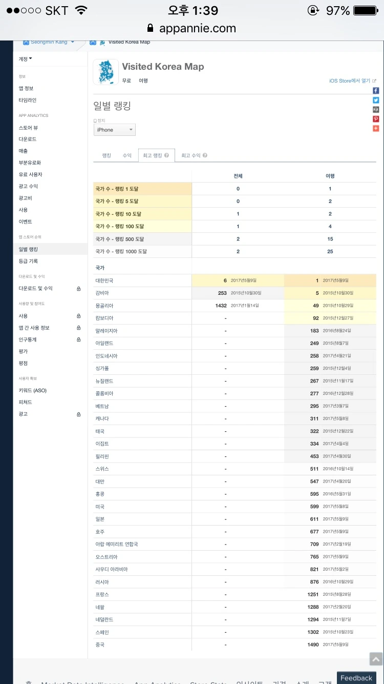 잠깐 자랑 좀 하겠습니다. 이날 저희가 버티컬 앱으로 만든 가본 여행지에 색을 칠해주는 앱인 “대한민국 어디까지 가봤니?(Visited korea map)” 가 애플 앱스토어에서 여행 부분 1위를 했다는 소식을 접했습니다. 앱스토어에서 1위 한 앱 만든 업체가 되었습니다. (캡처는 2위로 떨어질 때 찍은 거네요.)