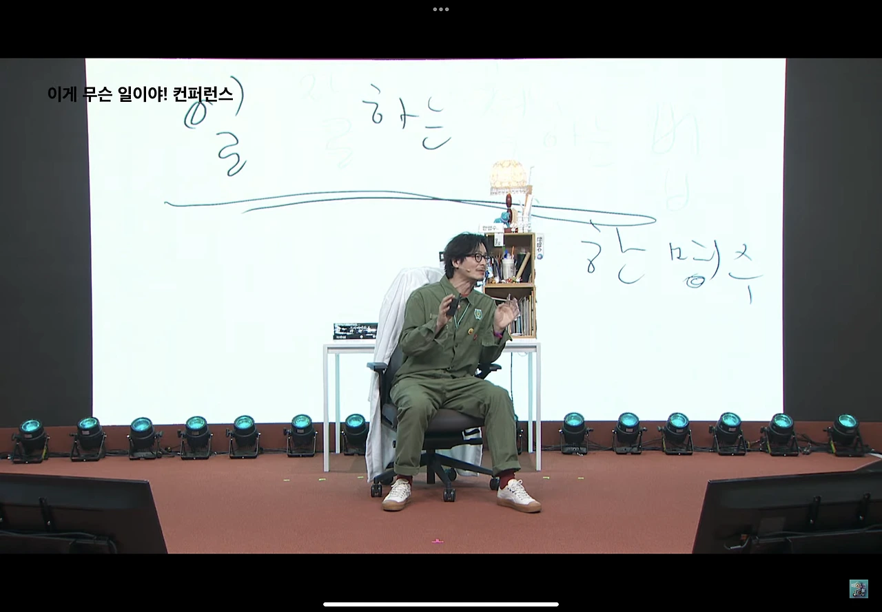 하지만 잘~ 살펴보면 점프슈트는 안상수 디자이너 때부터 이어지는 디자이너의 교복이며 피피티 장표 하나하나 일일이 손으로 쓴 데다 모든 장표에 움직이는 이미지까지 직접 만들어 넣었다. 게다가 내용의 주제는 잘하는 척! 하지 말자가 결국 핵심이기 때문에 손으로 갈겨쓴 것마저 주제에 잘 맞는 디자인이라 볼 수 있다.