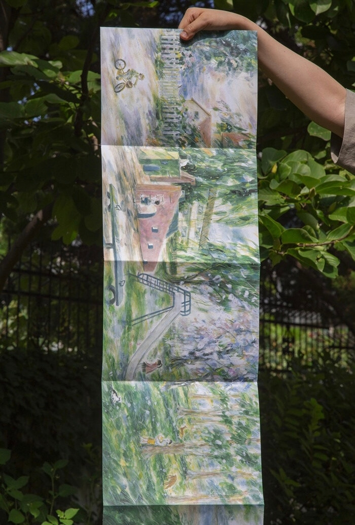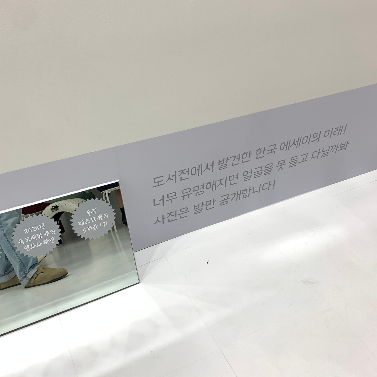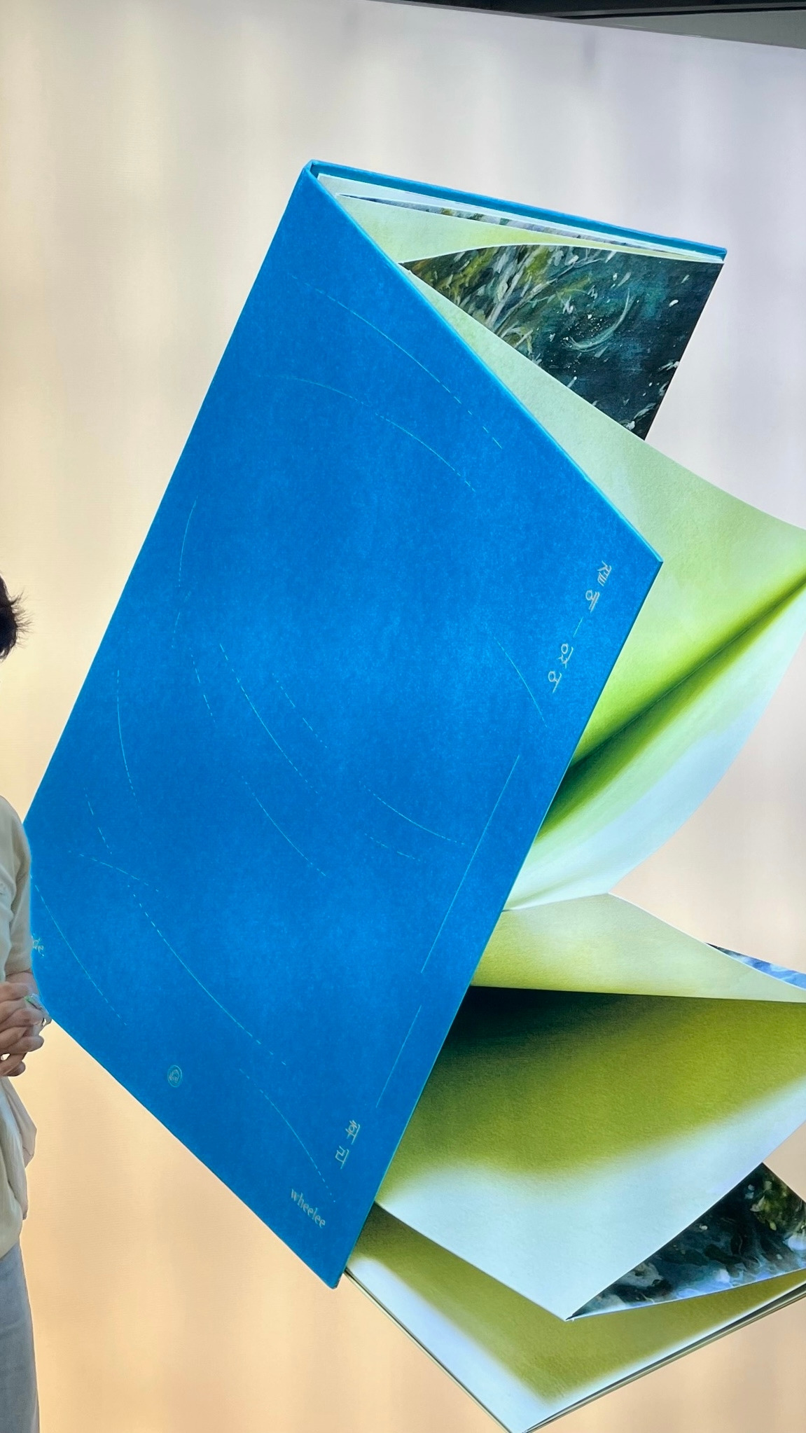 아마 더 많은 사람들이 오며가며 보라고 책을 크게크게 구현해둔 것 같았다. 크게 만들어진 책 등에는 실제 책들이 놓여져있었다. 단 한권만 전시하듯 놓여진 위엄에 손을 대기가 어려울 수 있었으나 표지만 보고 알 수 없었던 책인 곁에 있어를 펼쳐보았다. 안 펼쳐보면 서운할 정도로 내지가 아름다웠다. 특히 내지는 아코디언처럼 이어져 있는데, 그림도 이어져 있는 것이 마치 모네의 연못 같았다.