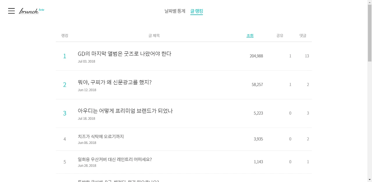 브런치를 하면서도 똑같은 전략을 취했다. '브랜딩'에 관심이 많은 사람은 내 브런치를 구독하겠지만, 이것에만 의존할 수는 없었다. 브런치에도 추천 목록들이 있으니, 브런치 추천 목록에 오르는 것을 목적으로 글을 썼다. 특히 제목과 첫 이미지에 공을 들였다. (요새는 초심을 잃었다..) 이 전략도 들어맞었다. 심지어 내 예상을 넘어섰다. 카카오 채널에 글이 소개되면서 조회수가 20만을 넘어서게 되었다.