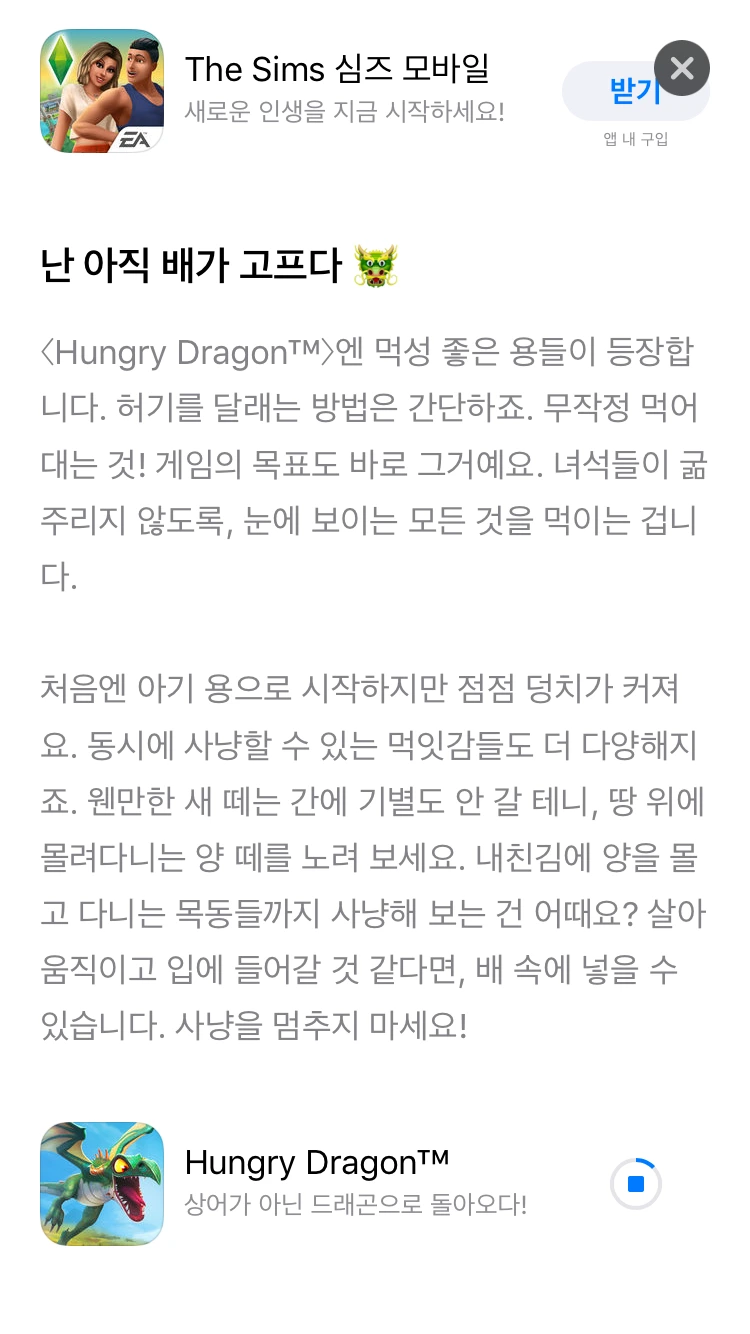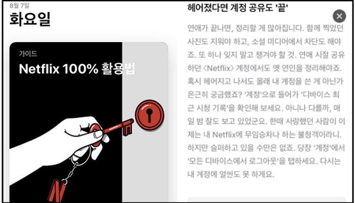 넷플릭스 프로필 이미지 업데이트 날에 맞춰 넷플릭스 가이드 문구가 업로드되었다. 보통 업데이트 글은 딱딱하게 정보 위주로 쓰여지는 반면에 앱스토어 글은 위트있고 친근하게 쓰여있다. 이 글을 본 뒤로 종종 앱스토어에 들어가 다른 추천 글을 보게 시작했다. 다음은 내가 마음에 들었던 소개문구들이다.