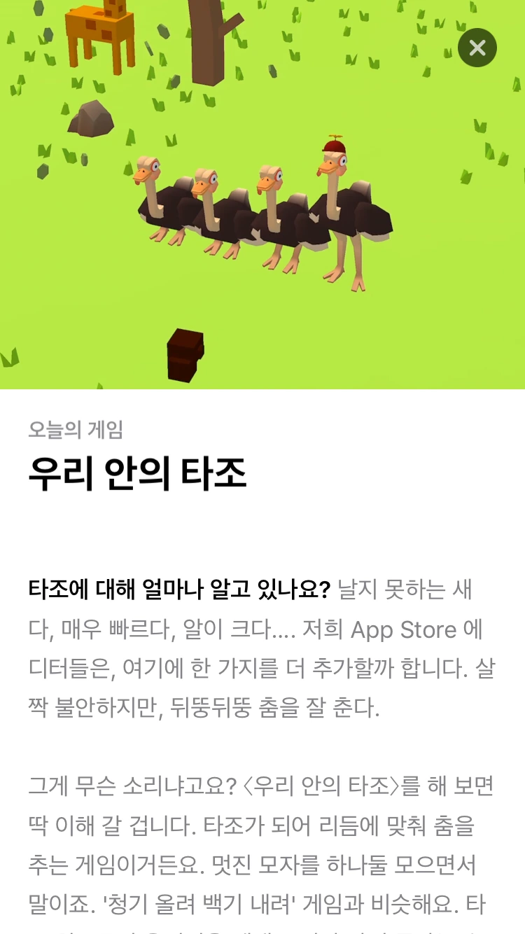 내가 좋다고 생각한 기준은 내가 해당 어플을 다운로드했는가로 정했다. 우리 안의 타조 어플은 문구도 귀엽지만 게임 영상도 귀여워서 보자마자 다운받았다. 귀여운 이미지에 비해 게임 난이도는 꽤 어렵다.