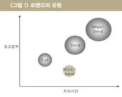 먼저, 트렌드에도 종류가 있다. 하루부터 일주일, 한달 정도 반짝 유행하는 것은 패드(Fad)라 한다. SNL에서 다뤄 급 유행했던 급식체가 대표적인 패드다. 1~2년간 비교적 소수 집단에서 유행하는 것들은 마이크로 트렌드라 한다. 아크로님이 이끌고 있는 테크웨어 스타일 대표적인 경우다. 2년에서 5년 정도 유행해야 비로소 트렌드가 된다. 발렌시아가에서 시작한 어글리슈즈는 이제 트렌드가 됐다고 봐야한다. 5년을 넘어 10년간 유행하면 메가 트렌드라 한다. 우리나라 가요계의 걸그룹 열풍이 올해로 12년쯤 되가니 메가 트렌드라 할 수 있겠다.