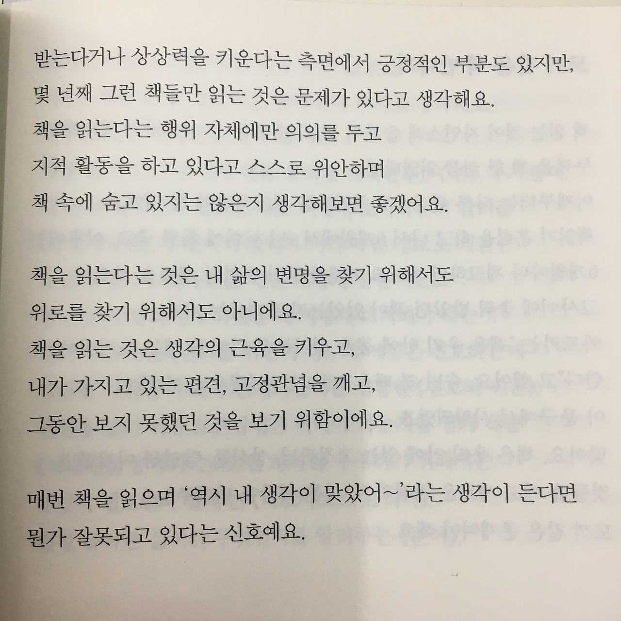 게다가 이번에 이 책을 읽다가 이 페이지에서 너무 찔렸다. 시간은 없고, 읽은 책은 쌓이면서 더 이상 생각을 하기 위한 독서가 아니라 소모하기 위한 독서를 한다는 느낌이 들었다. 얼마전 친구와 취미에 대해 이야기하면서 “소모적인 것보다 생산적인 취미를 갖고 싶어”라 말했던 것이 불현듯 스쳤다.