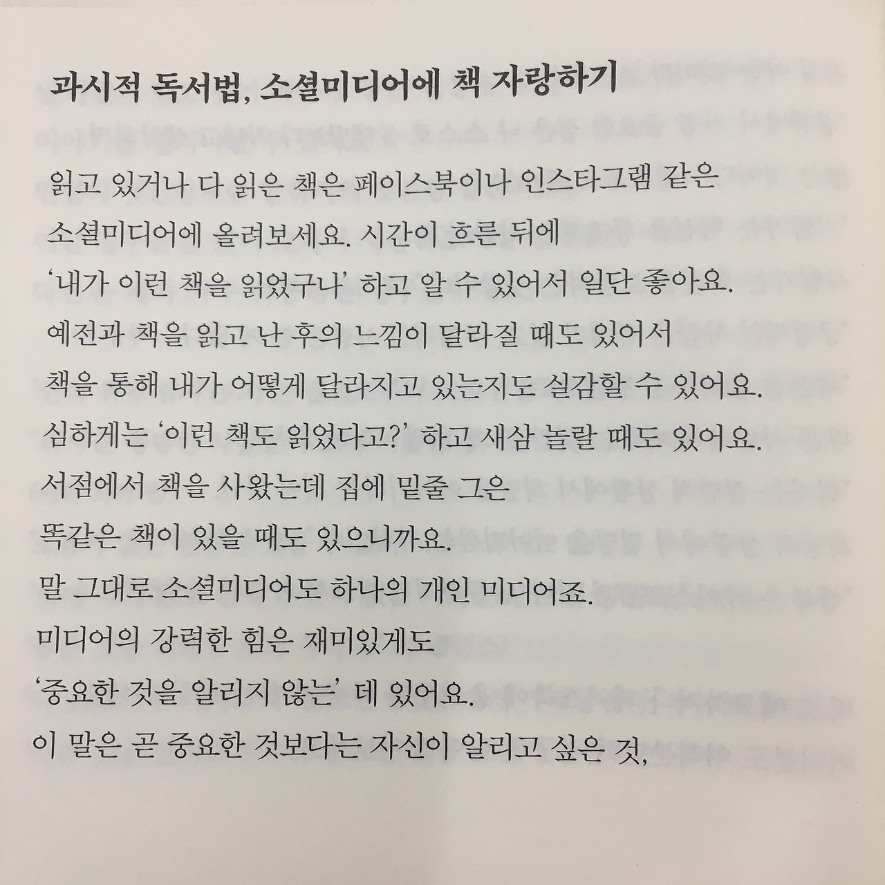 이런 독서를 김봉진 작가님은 ‘과시적 독서’라고 솔직하게 밝혔다. 과시적이란 말에 부정적인 뉘앙스가 많이 느껴지지만 과시하고 싶은 것은 사람의 본능이라 밝히고 있다. 책만큼 가장 적은 돈으로 아주 있어보이는 것도 없다는 말에도 공감한다. 그래서 나도 매주 읽은 책을 SNS에 공유하기 시작했다.