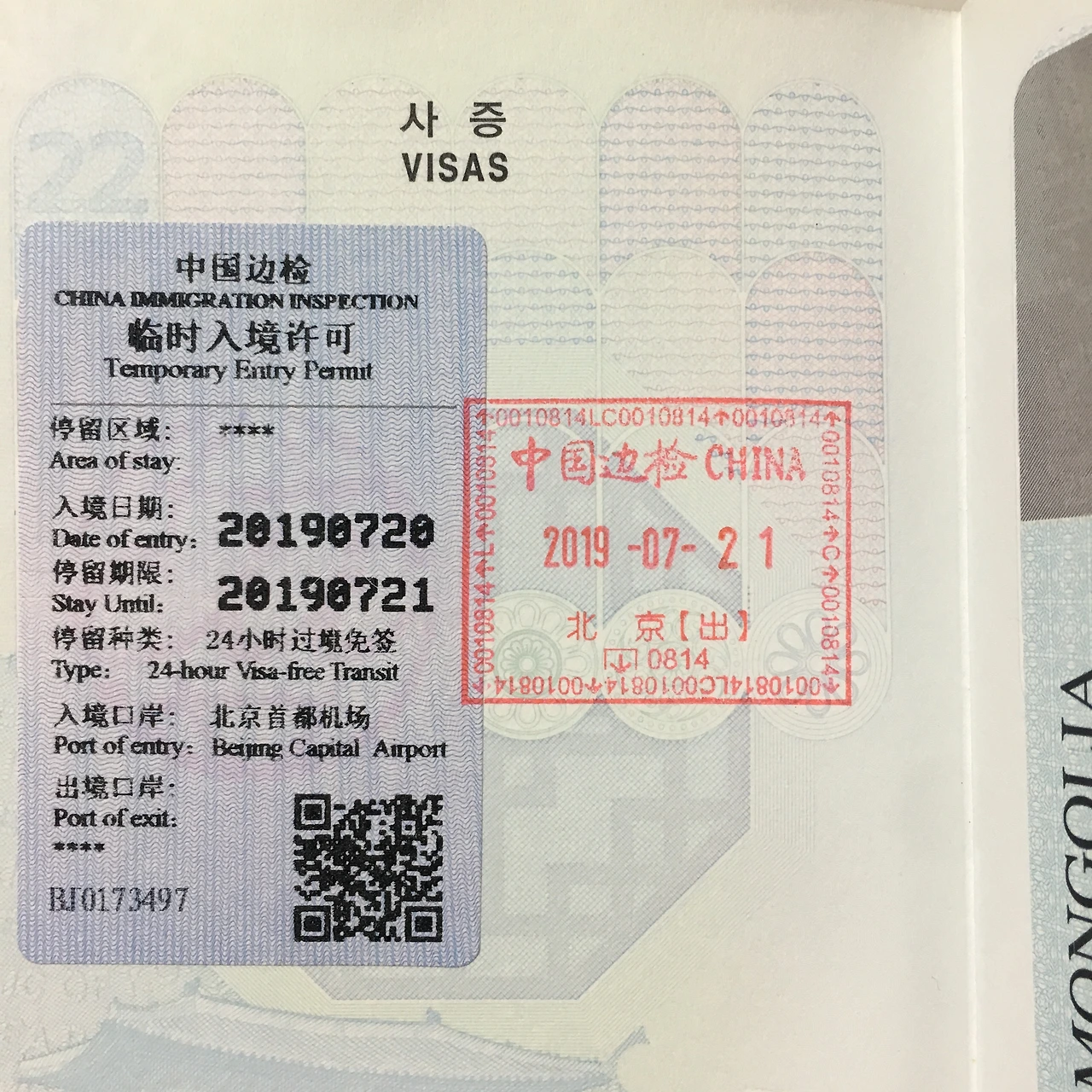 24시간 경유 중국 비자를 받았으니